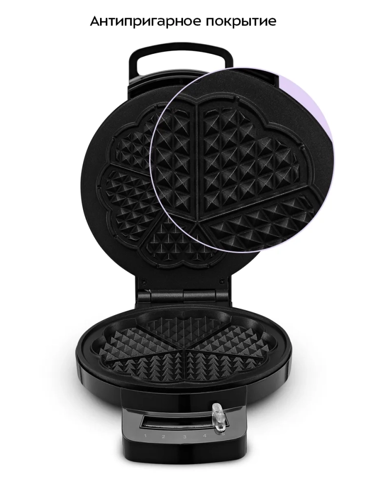 С помощью электрической вафельницы Kitfort КТ-4689 вы сможете печь вафли в форме цветка, которые при желании можно разделить на сердечки. Вафельница рассчитана на приготовление 1 вафли в форме цветка или 5 маленьких вафель в форме сердечек.