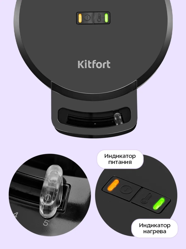 Вафельница оснащена индикаторами питания и нагрева, а также термостатом для поддержания температуры нагрева панелей. С помощью регулятора температуры вы можете менять температуру приготовления.