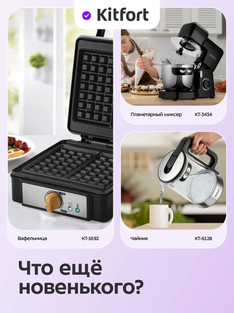 Электрическая вафельница Kitfort — это не просто прибор для выпечки вафель, но и универсальная техника, способная стать незаменимым помощником на вашей кухне. Благодаря мощным электрическим элементам, вафельница быстро нагревается и поддерживает стабильную температуру, что гарантирует равномерное пропекание вафель. Вафельницы Kitfort отличаются высоким качеством сборки и долговечностью, что делает их идеальным выбором для любителей домашней выпечки.