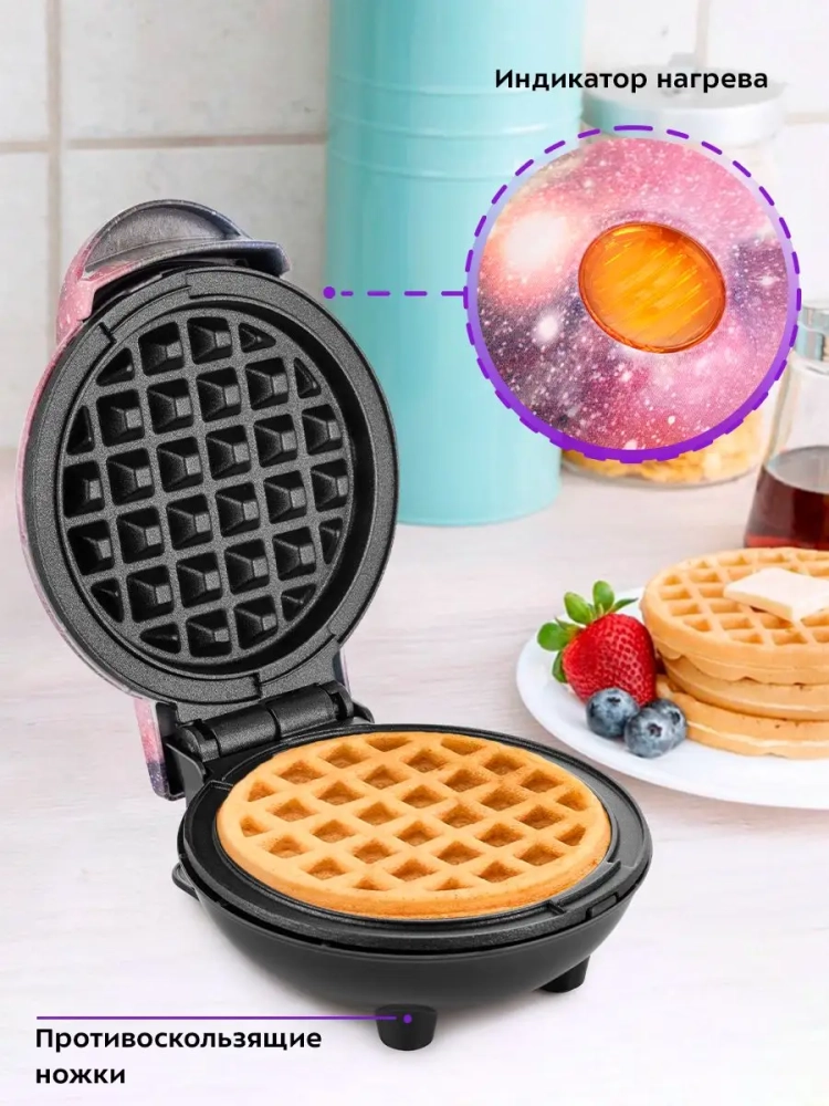Антипригарное покрытие помогает не прилипать тесту в процессе приготовления и позволяет готовить с минимальным количеством масла или без него. Также антипригарное покрытие панелей облегчает чистку, что особенно важно, так как панели являются несъемными. Вафельница оснащена индикатором нагрева, термостатом для поддержания температуры панелей.