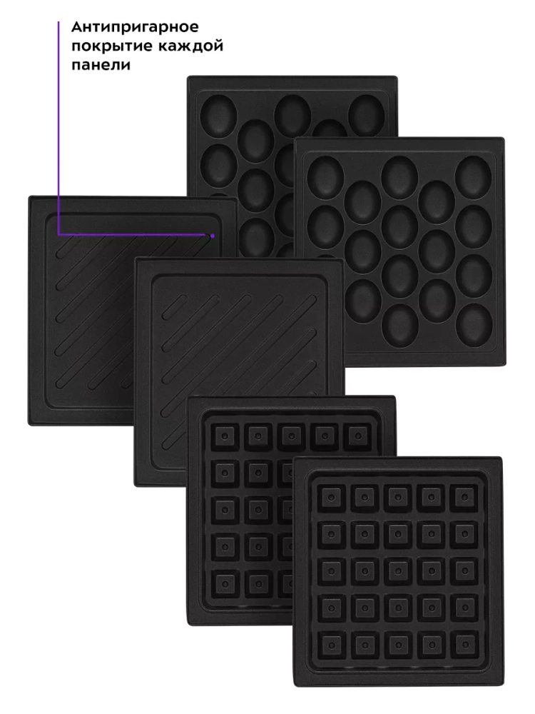 Антипригарное покрытие не дает прилипнуть тесту в процессе приготовления и позволяет готовить с минимальным количеством масла или без него. Также антипригарное покрытие облегчает чистку панелей. Вафельница оснащена индикатором нагрева, а также термостатом для поддержания температуры панелей.