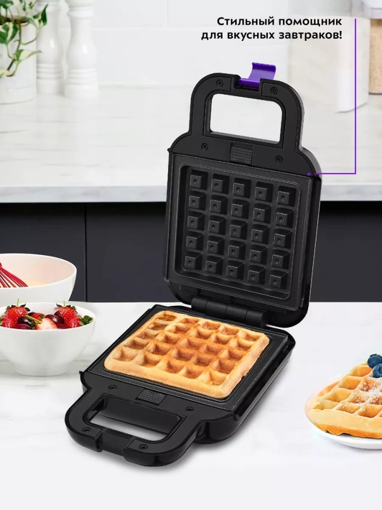 Вафельница рассчитана на приготовление 1 порции блюда. Компактный размер вафельницы позволяет экономить место на кухне.