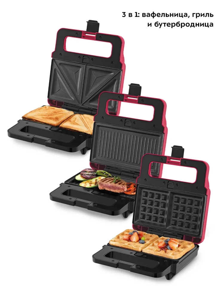 У прибора три пары панелей: панели для приготовления вафель, панели для приготовления бутербродов и ребристые панели для гриля. Высокая температура панелей способствует быстрому приготовлению продуктов. Для удобства ухода панели сделаны съемными — их можно мыть под проточной водой.