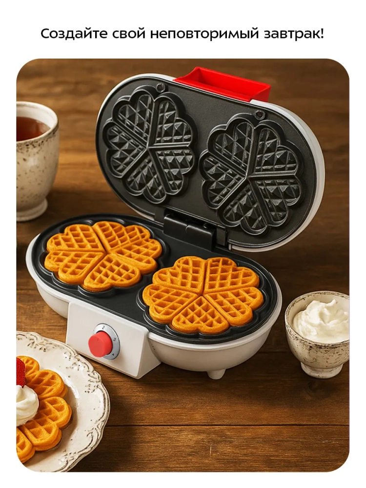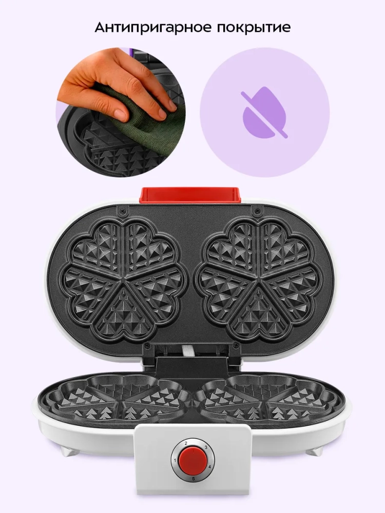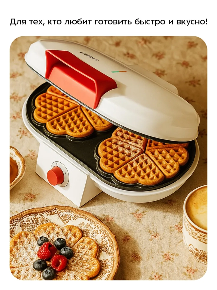 С помощью электрической вафельницы Kitfort КТ-4622 вы сможете печь вафли в форме цветка, которые при желании можно разделить на маленькие сердечки. Вафельница рассчитана на приготовление 2 вафель в форме цветка или 10 маленьких вафель в форме сердечек.