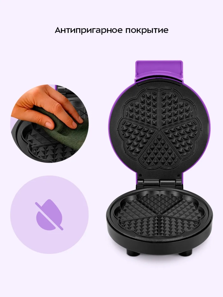 Антипригарное покрытие не дает прилипнуть тесту в процессе приготовления и позволяет готовить с минимальным количеством масла. Также антипригарное покрытие облегчает чистку панелей. Вафельница оснащена индикаторами питания и нагрева, а также термостатом для поддержания температуры панелей.