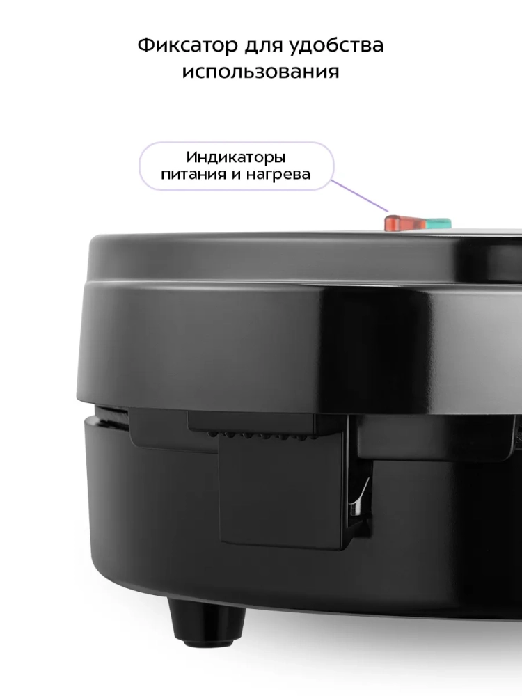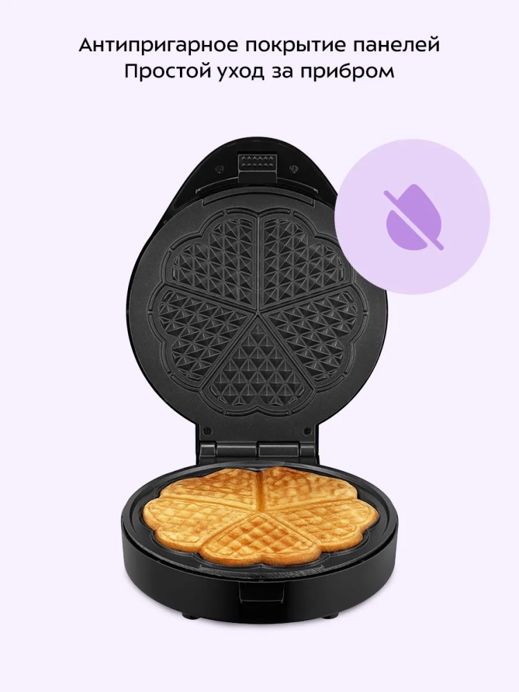 Антипригарное покрытие не дает прилипнуть тесту в процессе приготовления и позволяет готовить с минимальным количеством масла. Также антипригарное покрытие облегчает чистку панелей. Вафельница оснащена индикаторами питания и нагрева, а также термостатом для поддержания температуры панелей.
