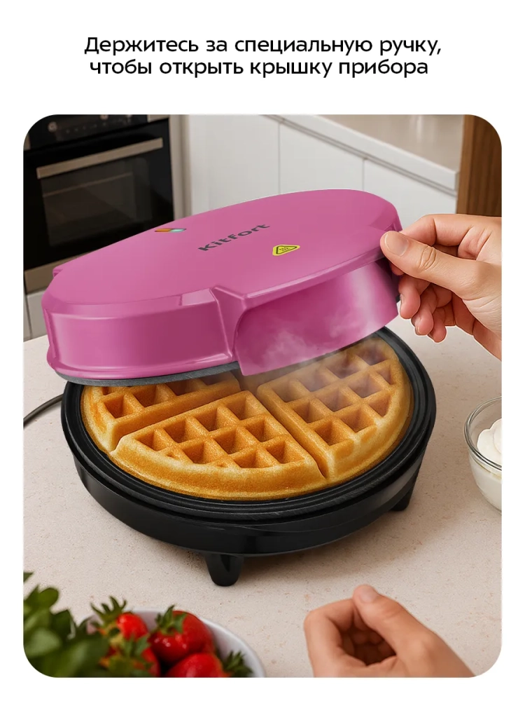 С помощью электрической вафельницы Kitfort КТ-4621 вы сможете печь бельгийские вафли, которые при желании можно разделить на треугольники. Вафельница рассчитана на приготовление 1 круглой вафли или 4 треугольных вафель.