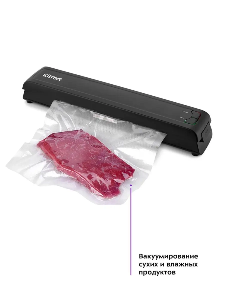 Вакууматор Kitfort КТ-1507 — устройство для вакуумной упаковки продуктов. Вакуумирование позволяет защитить от пыли, грязи, сохранить аромат и продлить сроки годности пищевых продуктов. Такой метод хранения уменьшает риск развития бактерий, которые появляются благодаря взаимодействию пищи с воздухом. Удаление воздуха из пакета гарантирует замедление процессов брожения, окисления и испарения, позволяя сохранить приятный внешний вид и качество самых разных продуктов питания.