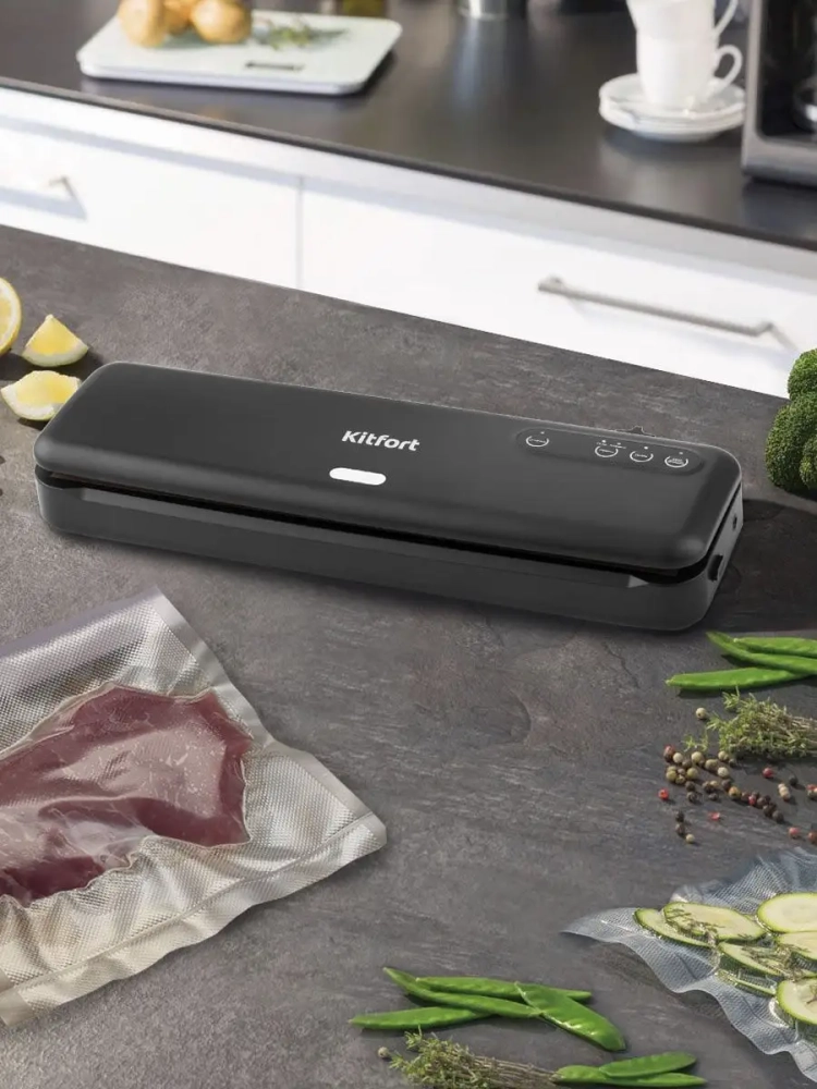 Вакууматор Kitfort КТ-1509 — устройство для вакуумной упаковки продуктов. Вакуумирование позволяет защитить от пыли, грязи, сохранить аромат и продлить сроки годности пищевых продуктов. Такой метод хранения уменьшает риск развития бактерий, которые появляются благодаря взаимодействию пищи с воздухом. Удаление воздуха из пакета гарантирует замедление процессов брожения, окисления и испарения, позволяя сохранить приятный внешний вид и качество самых разных продуктов питания.