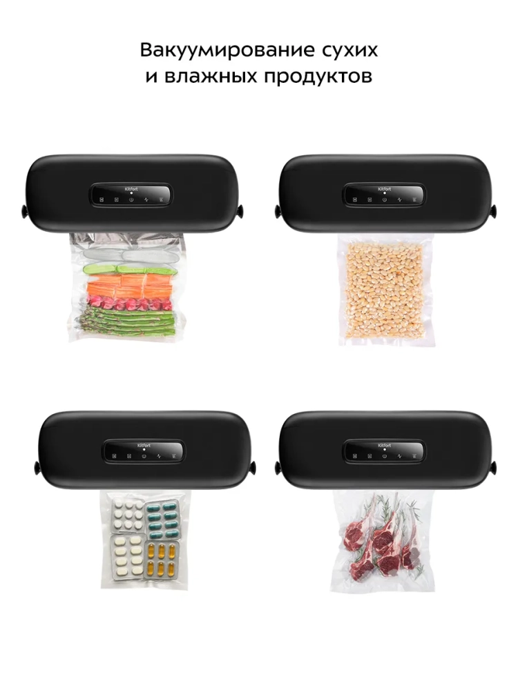 В KT-1550 есть возможность вакуумирования сухих и влажных продуктов. Импульсный режим поможет удалить нужный объем воздуха без последующего запечатывания пакета. Вы также можете запечатать пакет без предварительного вакуумирования. У прибора есть функция вакуумирования продуктов в специальных контейнерах.