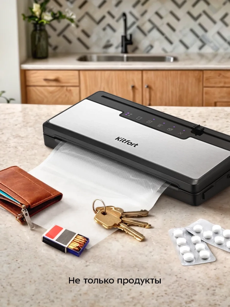 Вакууматор Kitfort КТ-1555 также может использоваться для упаковки вещей и аксессуаров, таких как документы, лекарства и даже серебряные украшения, защищая их от влаги и окисления. Это особенно полезно для хранения в холодильнике или морозильной камере, а также для экономии места в чемодане или дома.