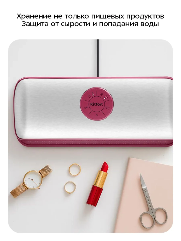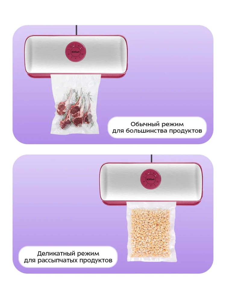Вакууматор для продуктов Kitfort КТ-1561 — это современное бытовое электрическое устройство, предназначенное для вакуумной упаковки различных продуктов. Вакуумирование позволяет надежно защитить продукты от пыли и грязи, сохраняя их аромат и продлевая срок годности. Этот метод хранения уменьшает риск развития бактерий, возникающих из-за взаимодействия пищи с воздухом. Удаление воздуха из пакета замедляет процессы брожения и окисления, что помогает сохранить внешний вид и качество продуктов питания. Вакууматор для кухонной запайки КТ-1561 прост в использовании: поместите продукт в специальный пакет для вакуумирования, уложите открытый край пакета в вакуумную камеру устройства, закройте крышку и включите прибор. Вакууматор удалит воздух из пакета автоматически. Устройство вакуум упаковщика Kitfort подходит не только для кулинарии: оно может использоваться для защиты документов или других предметов от влаги при помощи вакуумного пакета. Это делает его полезным как дома, так и на отдыхе или в путешествиях. Вакуумная упаковка техники помогает экономить место в холодильнике или чемодане благодаря компактности сжатого содержимого. Пакеты с удаленным воздухом занимают меньше пространства. Модель KT-1561 оснащена режимами для сухих и влажных продуктов; также есть отдельный режим запечатывания без предварительного вакуумирования. Световая индикация уведомляет о процессе работы устройства. Характеристики: напряжение ~220–240 В; мощность 110 Вт; класс защиты II; разряжение ≤0,8 бар; максимальная ширина пакета 28 см; ширина шва 2,5 мм; уровень шума ≤80 дБ; длина шнура 1 м.