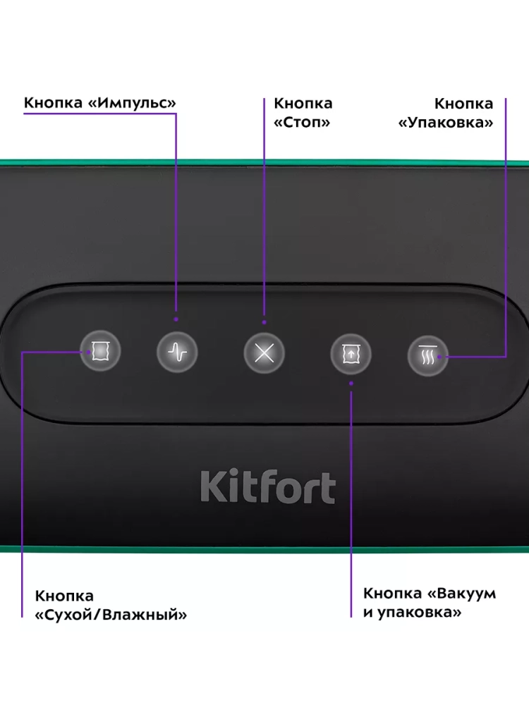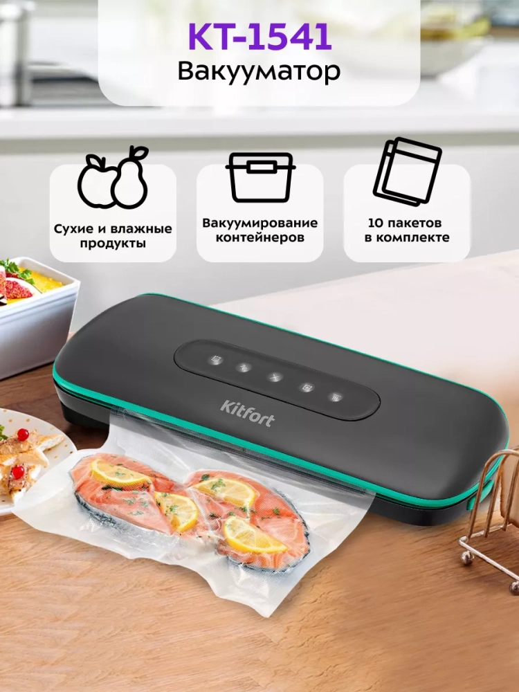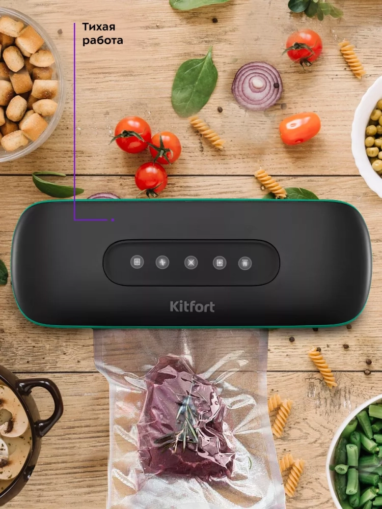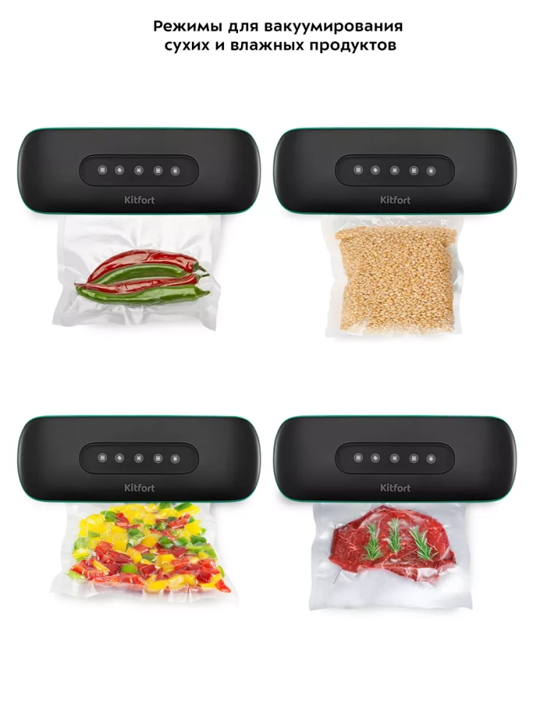 У KT-1541 есть режимы для вакуумирования сухих и влажных продуктов. Отдельный режим упаковки позволит вам запечатать пакет без предварительного вакуумирования. Импульсный режим поможет удалить нужный объем воздуха без последующего запечатывания пакета.