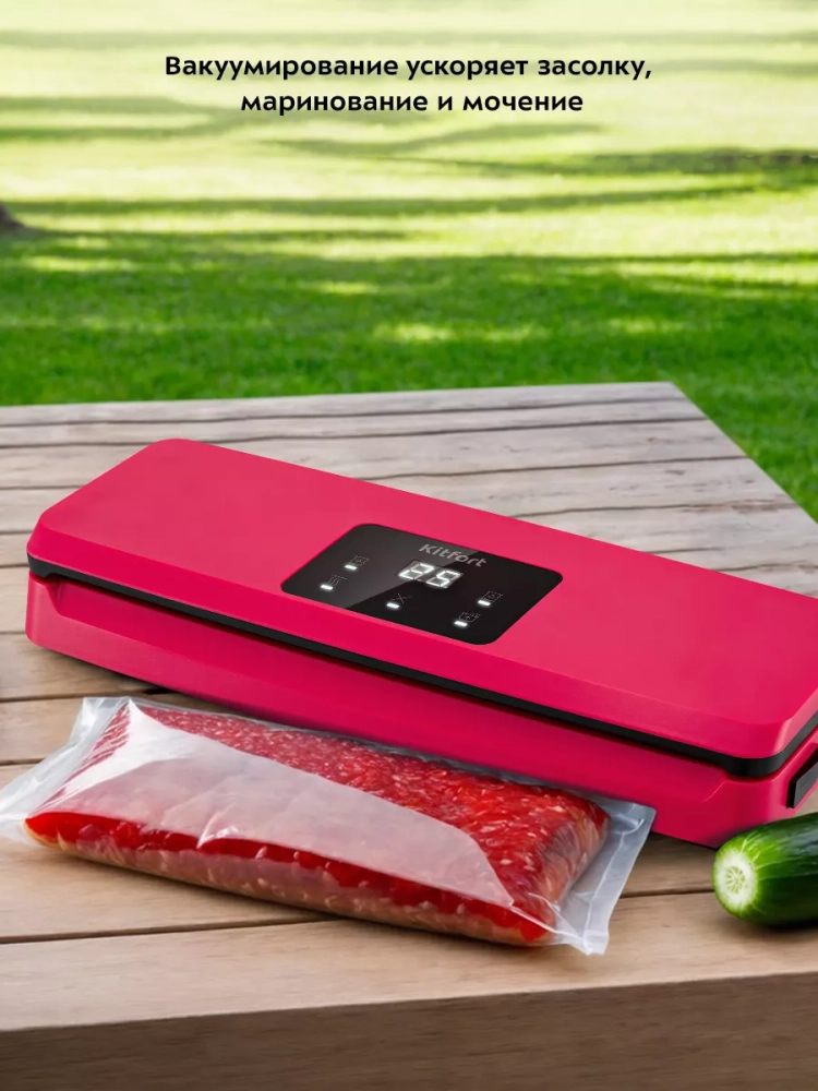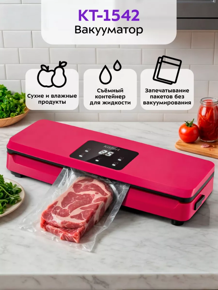 У KT-1542 есть режимы для вакуумирования сухих и влажных продуктов. Отдельный режим упаковки позволит вам запечатать пакет без предварительного вакуумирования. Также в КТ-1542 предусмотрен отдельный режим для вакуумирования продуктов в специальных контейнерах. На дисплее отображается таймер прямого отсчета в секундах при вакуумировании и таймер обратного отсчета при запечатывании.