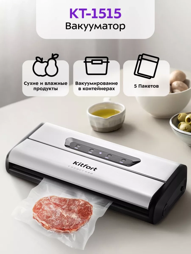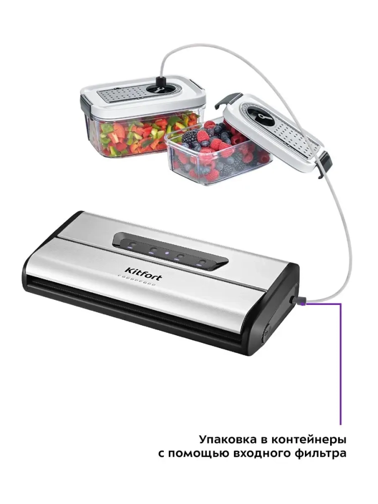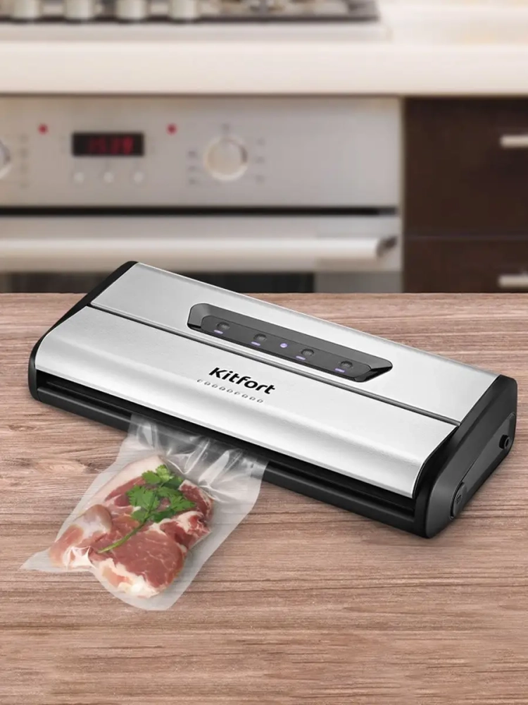 Вакууматор Kitfort КТ-1515 - устройство для вакуумной упаковки продуктов. Вакуумирование позволяет защитить от пыли, грязи, сохранить аромат и продлить сроки годности пищевых продуктов. Такой метод хранения уменьшает риск развития бактерий, которые появляются благодаря взаимодействию пищи с воздухом. Удаление воздуха из пакета гарантирует замедление процессов брожения, окисления и испарения, позволяя сохранить приятный внешний вид и качество самых разных продуктов питания. Вакууматор очень прост в использовании. Вакуумирование ускоряет засолку, маринование и мочение. В вакууме процесс обработки продуктов такими способами значительно ускоряется. Метод вакуумирования применяют не только в кулинарии, но и в других областях. Для туристических и бытовых нужд в вакуумный пакет можно поместить документы, деньги, спички, лекарства, мобильный телефон, карту, компас, чай и другие предметы. Охотники могут запаковать порох и патроны. Это защитит их от сырости и попадания воды. Серебряные украшения, коллекционные монеты, значки, упакованные таким способом, не будут тускнеть со временем. Вакуумная упаковка продуктов и вещей помогает значительно сэкономить место как в холодильнике, чемодане, так и по всей квартире. Пакеты с откачанным воздухом и сжатым содержимым занимают гораздо меньше пространства. В KT-1515 сбоку находится фитинг для подсоединения шланга, с помощью которого можно вакуумировать контейнеры. Отдельный режим пайки позволить вам запечатать пакет без предварительной откачки воздуха, а импульсный режим, наоборот, откачает воздух из пакета без пайки. Прорезиненные ножки делают устройство более устойчивым и не дают скользить по столу во время работы.