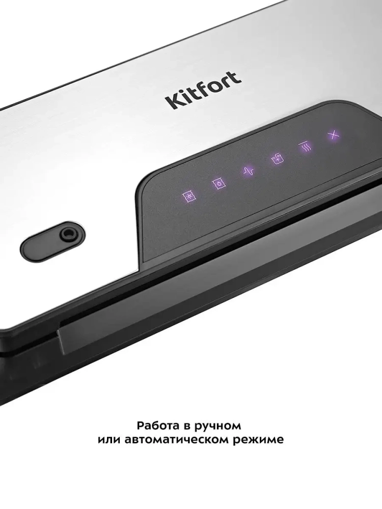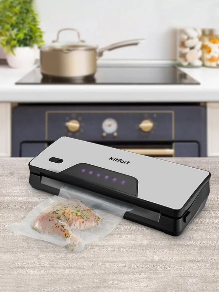 Вакууматор Kitfort КТ-1517 - устройство для вакуумной упаковки продуктов. Вакуумирование позволяет защитить от пыли, грязи, сохранить аромат и продлить сроки годности пищевых продуктов. Такой метод хранения уменьшает риск развития бактерий, которые появляются благодаря взаимодействию пищи с воздухом. Удаление воздуха из пакета гарантирует замедление процессов брожения, окисления и испарения, позволяя сохранить приятный внешний вид и качество самых разных продуктов питания. Вакууматор очень прост в использовании. Метод вакуумирования применяют не только в кулинарии, но и в других областях. Для туристических и бытовых нужд в вакуумный пакет можно поместить документы, деньги, спички, лекарства, мобильный телефон, карту, компас и другие предметы. Охотники могут запаковать порох и патроны. Это защитит их от сырости и попадания воды. Серебряные украшения, коллекционные монеты, значки, упакованные таким способом, не будут тускнеть со временем. Вакуумная упаковка продуктов и вещей помогает значительно сэкономить место как в холодильнике, чемодане, так и по всей квартире. Пакеты с откачанным воздухом и сжатым содержимым занимают гораздо меньше пространства. В KT-1517 есть режимы для вакуумирования сухих и влажных продуктов. Отдельный режим пайки позволить вам запечатать пакет без предварительной откачки воздуха, а импульсный режим, наоборот, откачает воздух из пакета без пайки. Понятная световая индикация сообщит о включении, смене и окончании выполняемого действия. Для вакуумирования контейнеров в КТ-1517 предусмотрен отдельный режим «Контейнер» — для откачки воздуха из емкостей. Встроенный резак поможет отрезать пакет нужной вам длины, а также срезать запаянный шов. Прорезиненные ножки делают устройство более устойчивым и не дают скользить по столу во время работы.