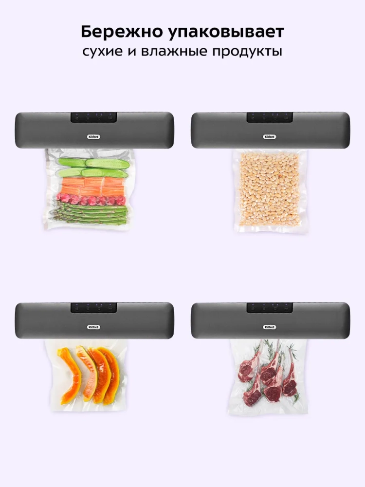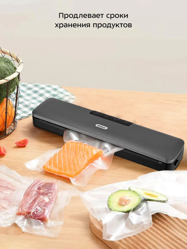 Вакууматор Kitfort КТ-1527 - устройство для вакуумной упаковки продуктов. Вакуумирование позволяет защитить от пыли, грязи, сохранить аромат и продлить сроки годности пищевых продуктов. Такой метод хранения уменьшает риск развития бактерий, которые появляются благодаря взаимодействию пищи с воздухом. Удаление воздуха из пакета гарантирует замедление процессов брожения, окисления и испарения, позволяя сохранить приятный внешний вид и качество самых разных продуктов питания. Вакууматор очень прост в использовании. Чтобы провести запаковку продукта, необходимо поместить его в специальный пакет, предназначенный для вакуумирования. Открытый край пакета укладывается в вакуумную камеру. После чего нужно закрыть крышку вакууматора и включить упаковку в автоматическом режиме. Вакууматор начинает выкачивать из пакета воздух. В результате образования вакуума пакет плотно обжимает содержимое. Как только воздух удален, начинается запечатывание открытой стороны пакета. В результате воздух уже не сможет проникнуть внутрь. Вакуумирование ускоряет засолку, маринование и мочение. В вакууме процесс обработки продуктов такими способами значительно ускоряется. Метод вакуумирования применяют не только в кулинарии, но и в других областях. Для туристических и бытовых нужд в вакуумный пакет можно поместить документы, деньги, спички, лекарства, мобильный телефон, карту, компас, чай и другие предметы. Охотники могут запаковать порох и патроны. Это защитит их от сырости и попадания воды. Серебряные украшения, коллекционные монеты, значки, упакованные таким способом, не будут тускнеть со временем. В KT-1527 есть режимы для вакуумирования сухих и влажных продуктов. Отдельный режим запечатывания позволит вам запечатать пакет без предварительной откачки воздуха, а импульсный режим, наоборот, откачает воздух из пакета без запечатывания. Прорезиненные ножки делают устройство более устойчивым и не дают скользить по столу во время работы.