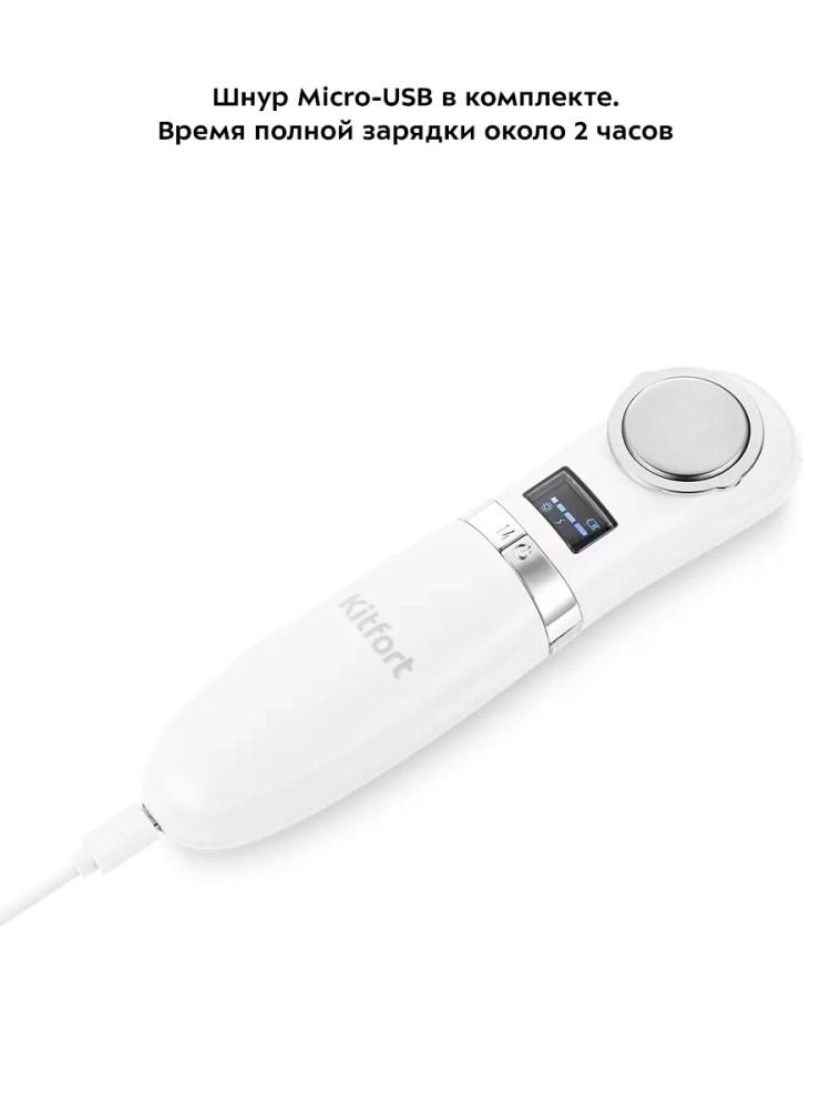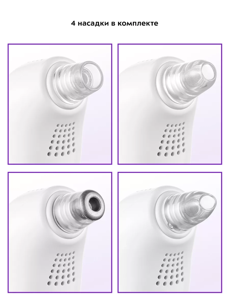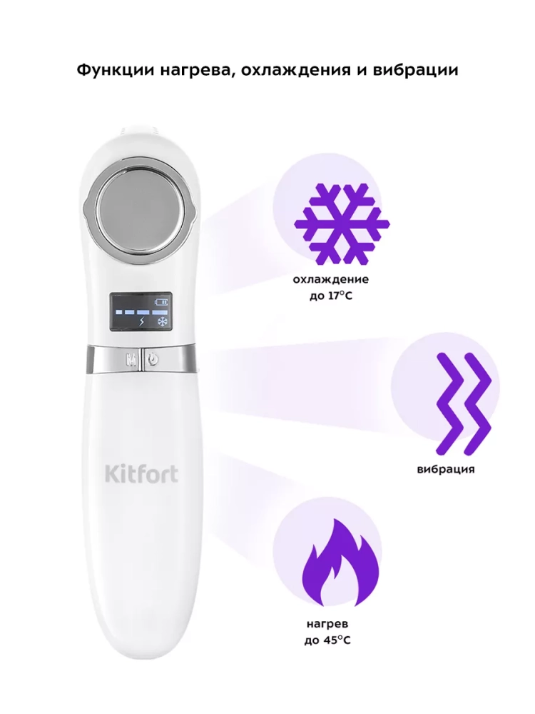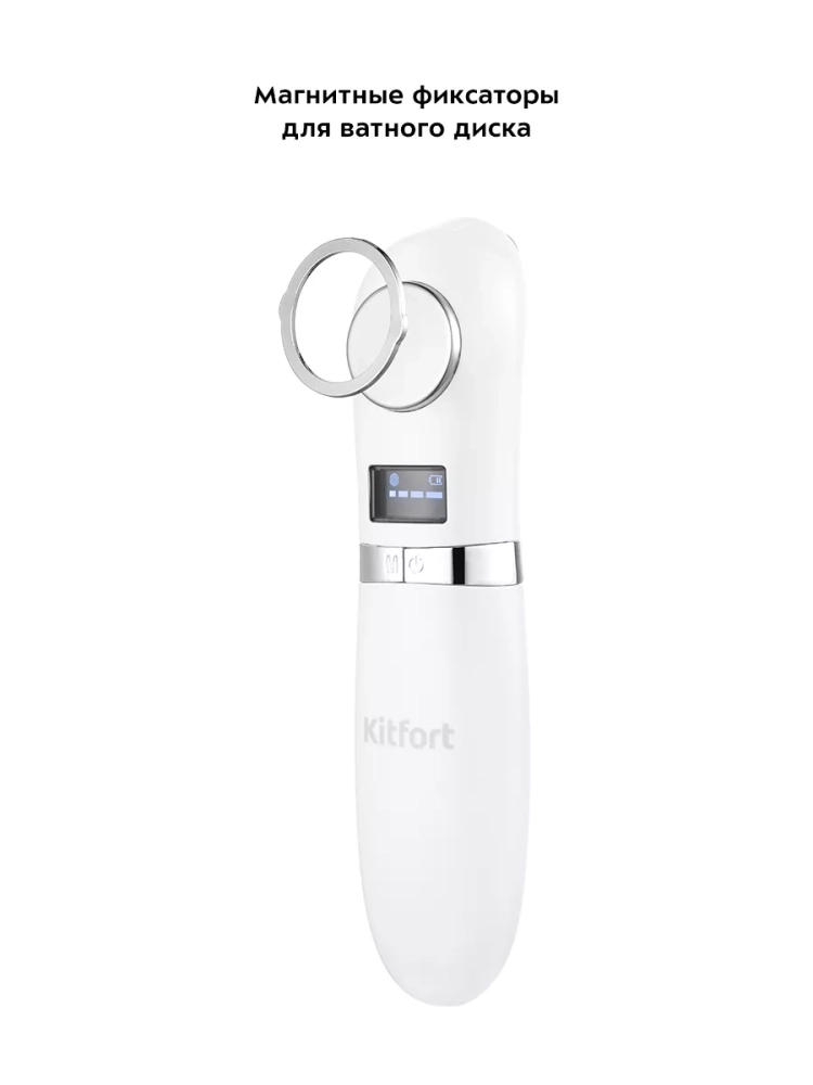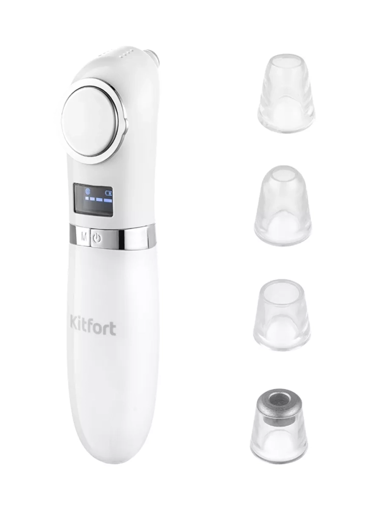 Вакуумный очиститель кожи Kitfort KT-3126 поможет очистить кожу от черных точек, сальных пробок и других загрязнений в порах. Вакуумная чистка кожи стимулирует кровообращение и регенерацию кожи, что улучшает цвет лица и убирает неглубокие морщины. Магнитным фиксатором на устройстве можно закрепить ватный диск, пропитанный ухаживающим косметическим средством. После чего включить вибрацию, чтобы добиться лучшего проникания косметического средства в кожу. Перед проведением вакуумной чистки необходимо открыть поры для максимальной эффективности процедуры. Для этого в устройстве предусмотрен нагрев. Чтобы после процедуры закрыть поры и успокоить кожу, воспользуйтесь охлаждением. Для лучшего эффекта включите вибрацию вместе с нагревом или охлаждением. Вакуумный очиститель кожи имеет 4 уровня силы всасывания для очищения разного типа кожи (сухой, нормальной, комбинированной и жирной) и 4 вида насадок. Большая круглая насадка нужна для удаления загрязнений из пор крупных участков кожи, например, Т-зоны. Малая круглая насадка подходит для глубокого очищения и удаления загрязнений на труднодоступных участках кожи. Использование микрокристаллической насадки способствует отшелушиванию поверхностного слоя кожи, который состоит из омертвевших клеток, а также полировке кожи. Для проведения вакуумной очистки чувствительных участков кожи, таких как уголки губ, предназначена овальная насадка. Вакуумный очиститель кожи работает от аккумулятора и имеет небольшие габариты, поэтому его удобно брать с собой в путешествие. Благодаря индикатору заряда на дисплее вы всегда будете знать, когда необходимо зарядить устройство. Также на дисплее отображаются индикаторы режимов и уровень силы всасывания.