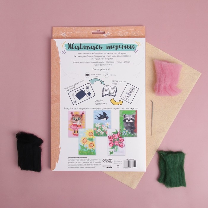 В этом наборе собрано всё самое необходимое для создания своими руками рисунка в технике сухого валяния на фетровой основе.