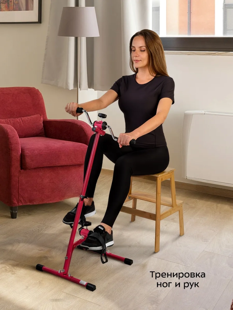 Тренажер для ног и рук имеет удобный руль и ручки, которые обеспечивают комфортное использование. Ручки и руль покрыты специальными накладками, предотвращающими скольжение и обеспечивающими надежный захват. Велотренажер также оснащен стойкой, которая обеспечивает устойчивость конструкции во время тренировки. Механическая система позволяет плавно изменять темп тренировки, что способствует улучшению дыхательных функций и укреплению дыхательных мышц.