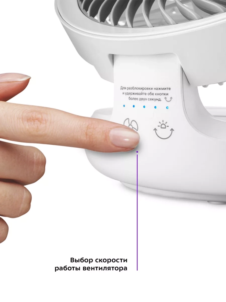 У устройства простое и надежное сенсорное управление. Есть четыре скорости работы, так что вы сможете выбрать наиболее комфортный для себя вариант: легкий освежающий бриз, умеренный или сильный поток ветра.