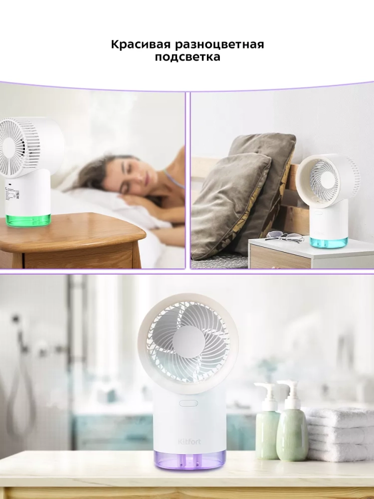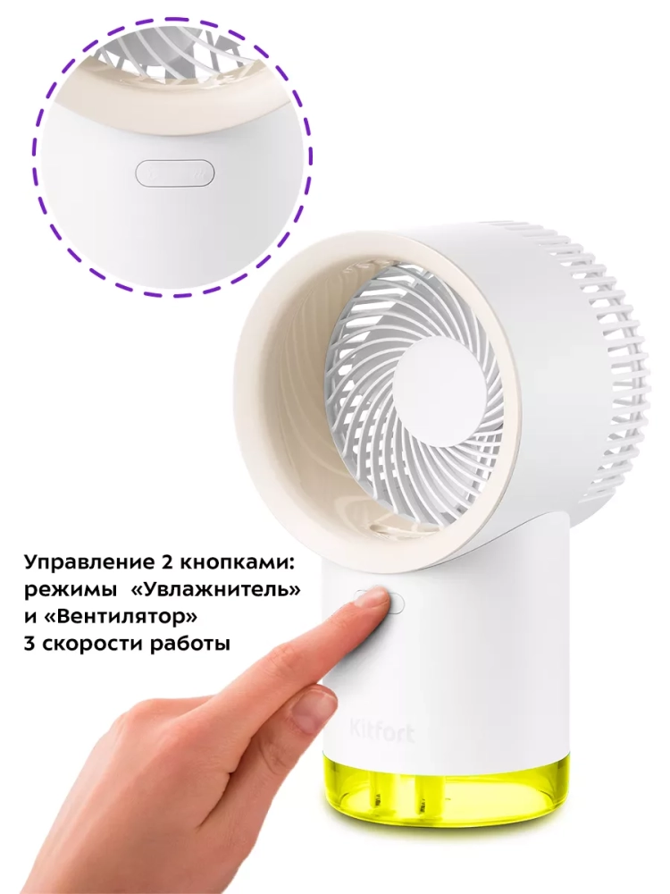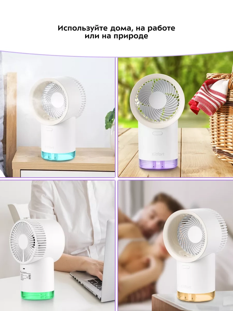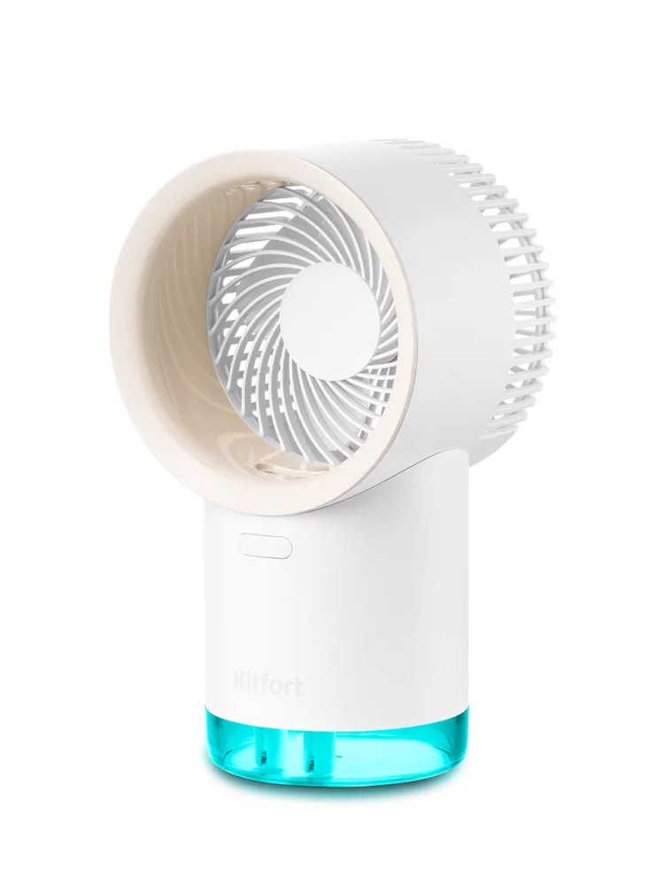 Беспроводной вентилятор-увлажнитель Kitfort КТ-417 - компактный портативный прибор, работающий от аккумулятора. Благодаря этим качествам он станет незаменимым помощником на прогулке или пикнике в жаркий день, ведь его можно переносить куда угодно. Вам больше не придется спасаться от знойной жары, сидя дома под кондиционером. Потоки свежего воздуха можно взять с собой! Вентилятор также можно использовать в помещении. Прибор создаст комфортный прохладный ветерок, избавит от духоты, не даст воздуху застаиваться. При этом можно заниматься любыми домашними делами, поставив устройство на ровную поверхность. Китфорт KT-417 имеет функцию увлажнения. Ультразвуковые увлажнители считаются наиболее эффективными из существующих увлажнителей воздуха. Принцип работы такого увлажнителя прост: внутри него стоит пьезокерамический излучатель, погруженный в воду, который с помощью ультразвуковых колебаний выбивает с поверхности воды мельчайшие капельки воды, создавая водяной туман. Этот туман выдувается наружу, а затем частицы воды разносятся по объему помещения потоками воздуха от включенного вентилятора. Совмещенный вентилятор и увлажнитель воздуха — идеальное сочетание для создания хорошего микроклимата для человека. У устройства простое и надежное управление. Есть три скорости работы, так что вы сможете выбрать комфортный для себя вариант: легкий освежающий бриз или более сильный поток. Лопасти вентилятора закрыты решеткой для безопасности. Световая индикация при работе подсвечивает весь резервуар для воды, она плавно меняет цвета, создавая красивую уютную атмосферу.