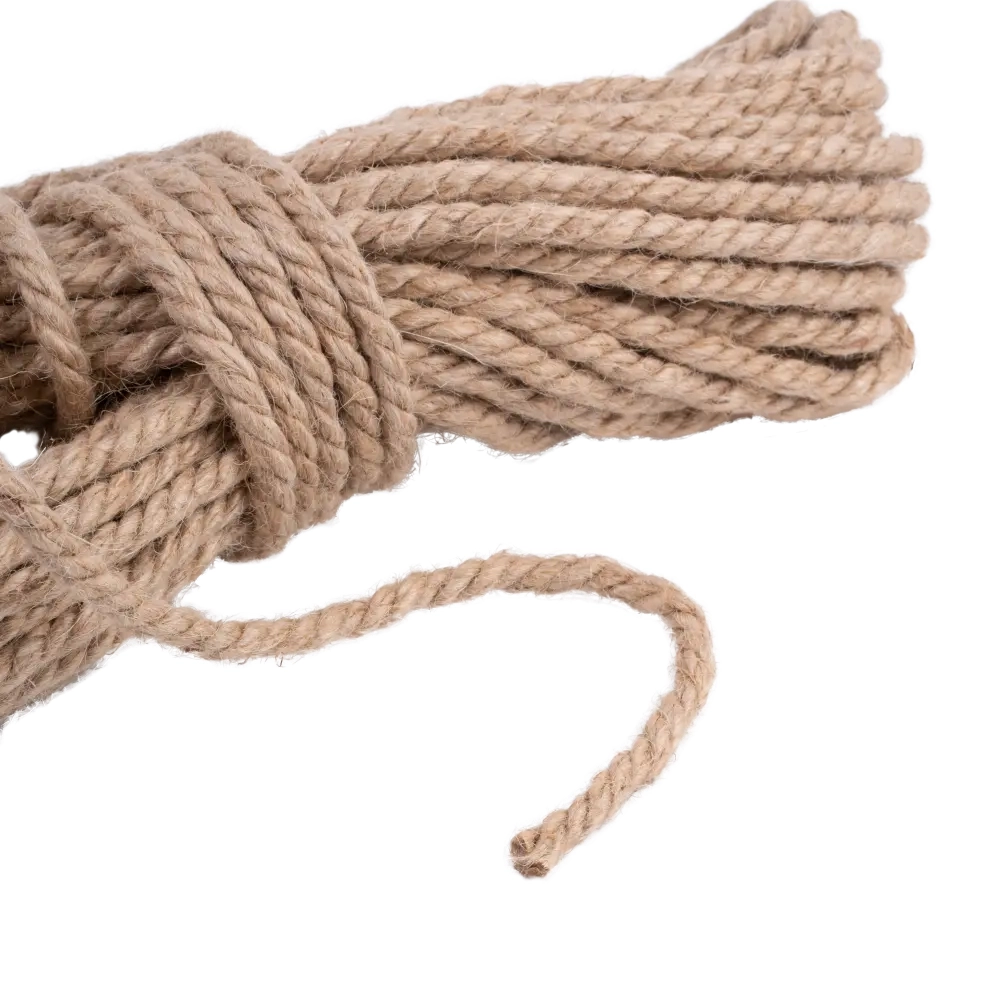 Веревка джутовая — крученое изделие многоразового использования, изготавливается методом тросовой свивки натуральных волокон джутового кустарника. Природная смола лигнин, которая содержится в джутовых волокнах, определяет не только устойчивость к влаге, но и прочность, упругость материала. Схожие с деревом характеристики и золотистый природный оттенок джута делают эти материалы максимально сочетаемыми.