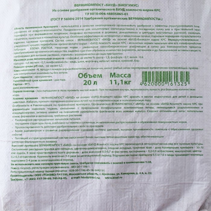 Эффективное органическое удобрение "БИУД" предназначено для активного развития плодовых, ягодных деревьев и кустарников, комнатных растений, зеленых культур, декоративных, ягодников и других растений. "БИУД-КОМПОСТ" прошел термическую обработку по новейшей технологии (не содержит болезнетворных бактерий, яиц и личинок гельминтов, опасны для здоровья человека) ограничений к применению не имеет. Обладает почвооздоровительным и почвообразовательным эффектом.Состав: торф низинный, коровий навоз, опилки, солома и другие органические добавки. ВНИМАНИЕ! Не применять как готовый почвогрунт.Рекомендации к применению:ВЕСНА:Внесение удобрений в почву с последующим перемешиванием: овощные в лунки 10-15 г (столовая ложка) в рядки 25-50 г (1/4- 1/2 стакана) на погонный метр. Ягодные - в посадочные ямы 0,2-0,3 кг (2-3 стакана). Фруктовые - в посадочные ямы 0,5-0,7 кг (банка 1 л).ВЕСНА, ЛЕТО:Подкормка любых овощных, ягодных, фруктовых культур приготовленным раствором: развести 400-500 г удобрений (3 стакана) на 8-10 л воды. Дать настояться 5-10 часов. Овощные - 0,5-0,75 л раствора на растение, 3-5 раза за сезон. Ягодные - 5-10 л раствора на куст, 3-5 раз за сезон. Фруктовые 10-20 л раствора на дерево, 3-4 раза за период (май-июнь).ОСЕНЬ:Для улучшения плодородия почвы - равномерное внесение удобрений с последующей перекопкой, при дозировке: 50-10 кг на сотку в зависимости от состояния почвы. На торфяных почвах вместе с "БИУД- КОМПОСТ" рекомендуется добавлять глину, возможно суглинок, в равном количестве.Для приготовления почвы под рассаду или под комнатные растения:50 г "БИУД-КОМПОСТ" на 1 кг почвы или грунта, тщательно перемешать, после высадки рассаду полить. Для подкормки высаженной рассады и лучшей ее приживаемости применять жидкие подкормки "БИУД".Питательные вещества:Массовая доля азота общего не менее 2%Массовая доля фосфора общего не менее 1%Массовая доля калия общего не менее 1%Массовая доля воды не более 60%Массовая доля органического вещества в пересчете на С не менее 30%Единица рН 7-8