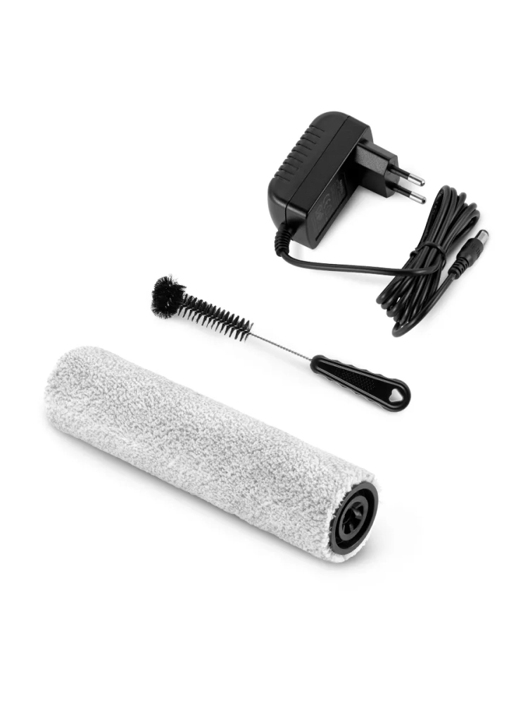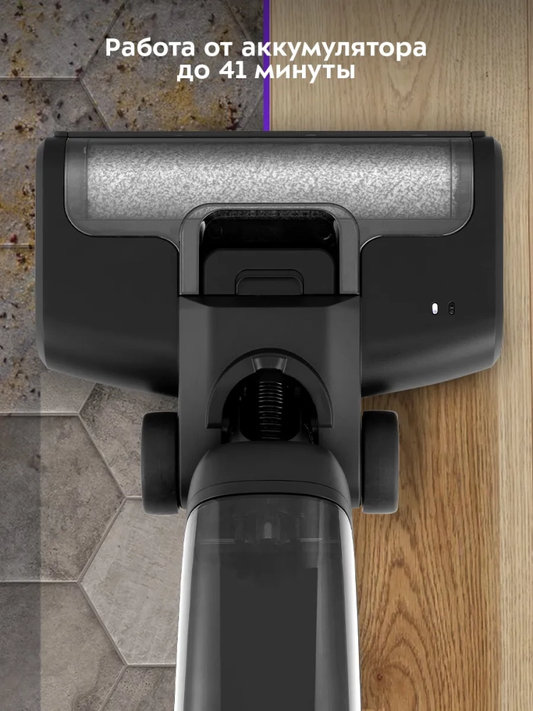 Принцип работы моющего пылесоса прост: благодаря непрерывному вращению валика турбощетки, вода равномерно распределяется по поверхности пола, а затем всасывается пылесосом и попадает в резервуар для грязной воды. Подсветка на турбощетке позволяет увидеть пыль и мусор в плохо освещенных зонах, например, под кроватью или диваном. Турбощетка моющего пылесоса предназначена только для сухой или влажной уборки гладких напольных покрытий внутри помещений и не подходит для уборки ковровых покрытий и мягкой мебели или для уборки на улице.