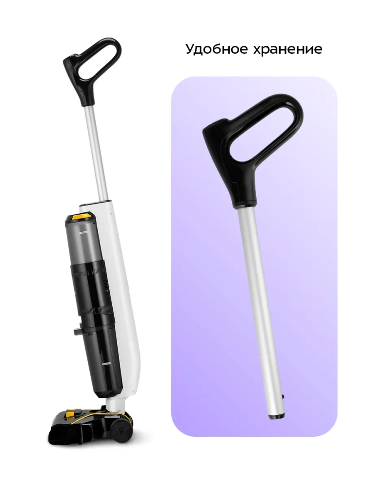 Благодаря работе от аккумулятора во время использования пылесос не нужно включать в сеть, и провода не будут мешать при уборке. Полностью заряженный пылесос работает до 20–25 минут в зависимости от выбранного режима.