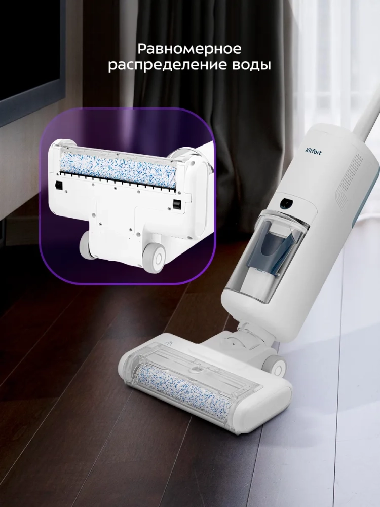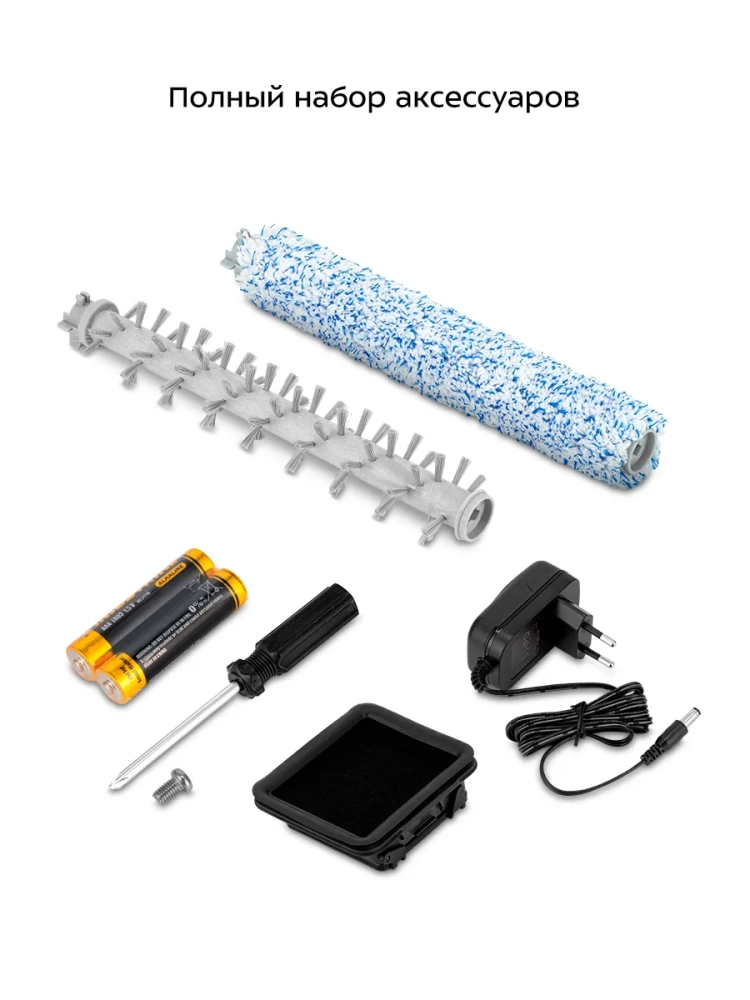 Пылесос комплектуется валиком турбощетки с покрытием из микрофибры, которая качественно впитывает воду и очищает гладкие поверхности полов. Ковровые покрытия также можно с легкостью почистить, ведь в комплекте идет второй валик для очистки ковров.