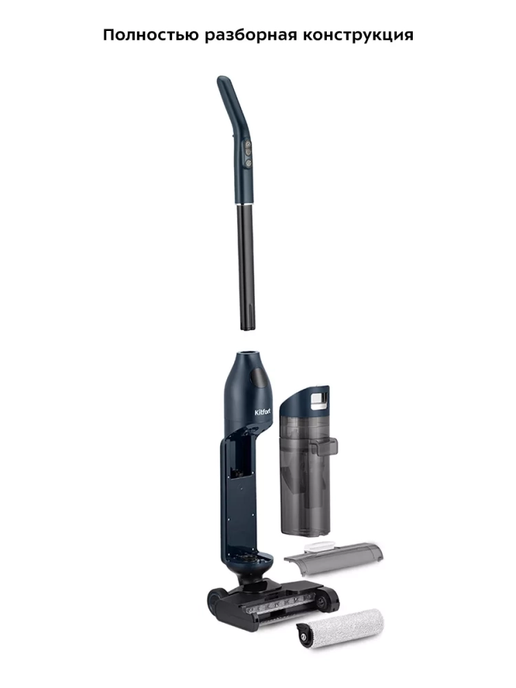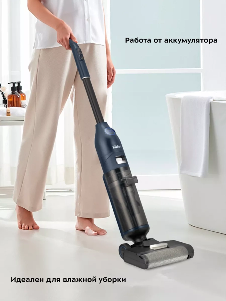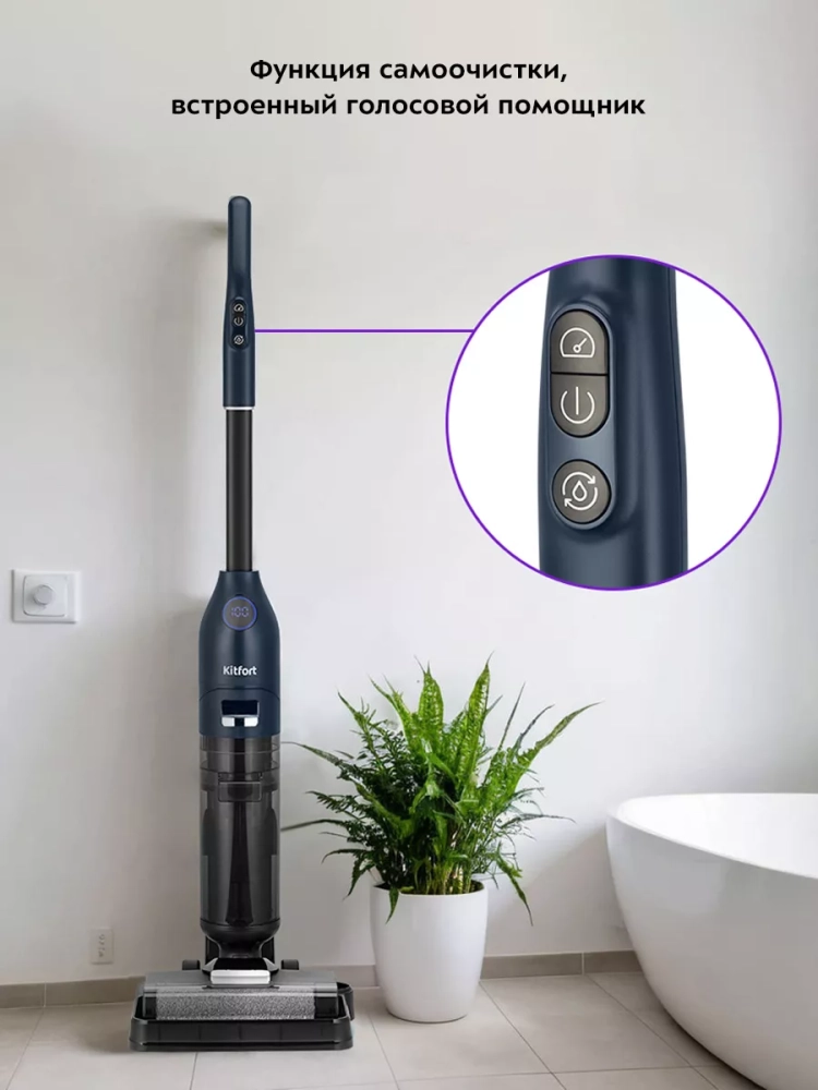 Беспроводной вертикальный моющий пылесос Kitfort КТ-5248 очень удобен при проведении влажной уборки. Благодаря работе от аккумулятора во время использования пылесос не нужно включать в сеть и провода не будут мешаться под ногами. В приборе есть голосовой помощник, который подскажет вам действия с пылесосом.