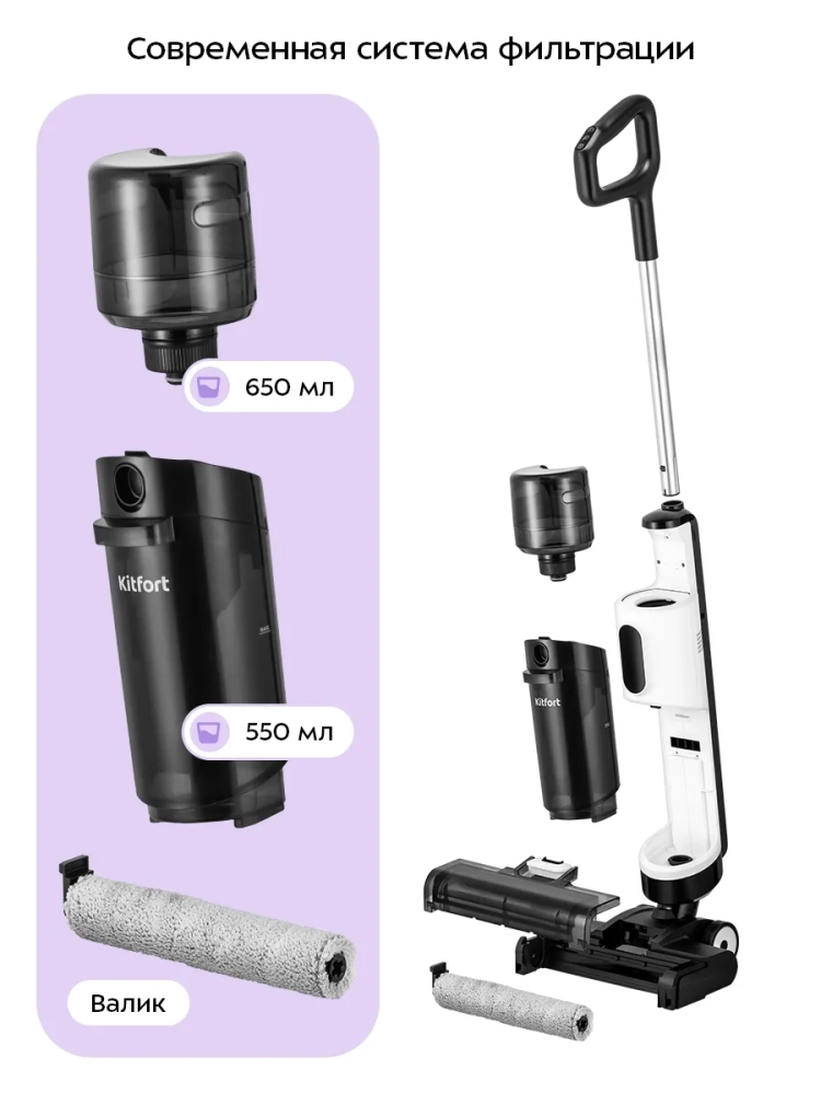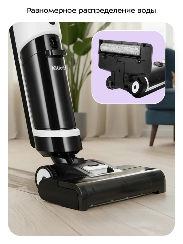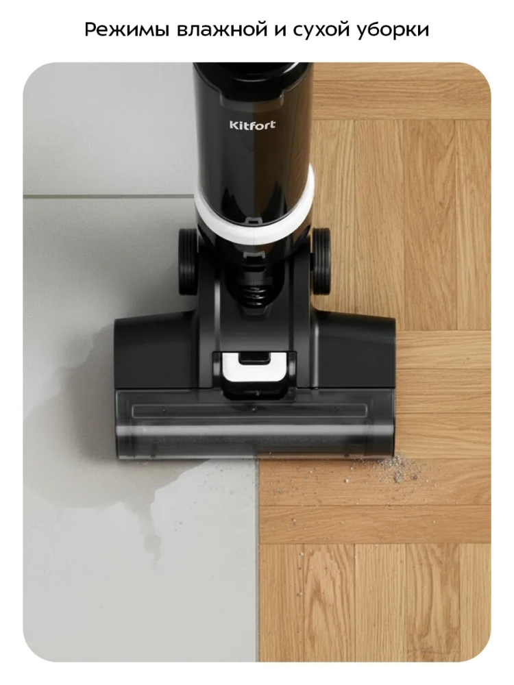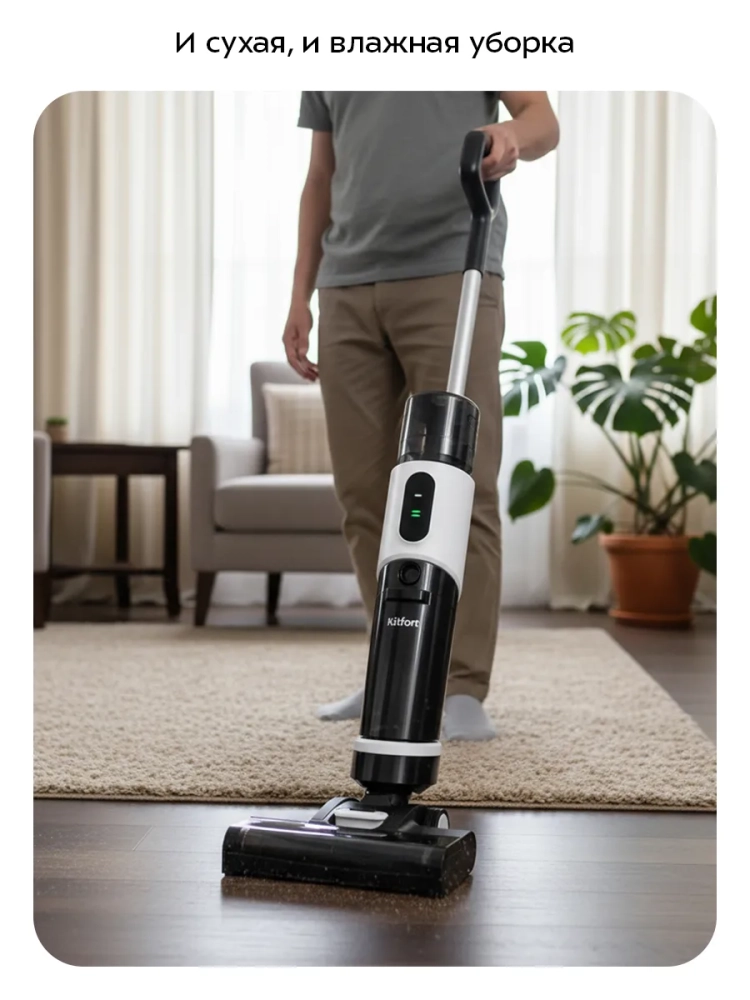 Беспроводной вертикальный моющий пылесос Kitfort КТ-5263 очень удобен для проведения влажной и сухой уборки. Благодаря работе от аккумулятора во время использования пылесос не нужно включать в сеть и провода не будут мешаться под ногами.