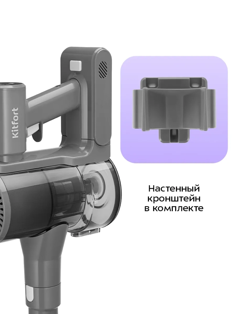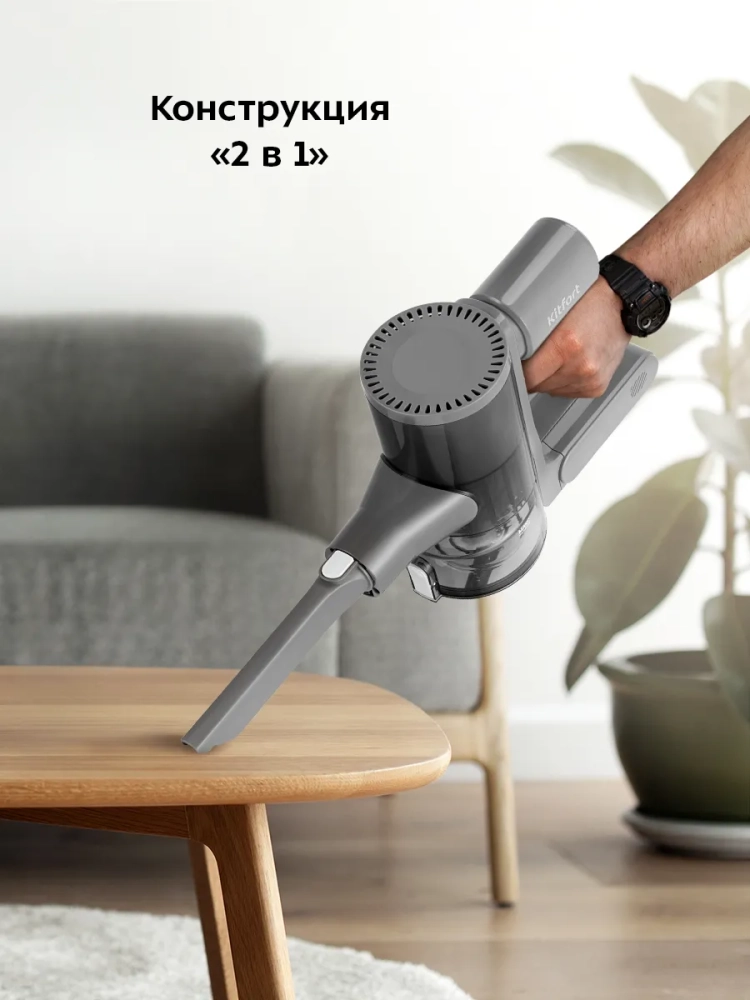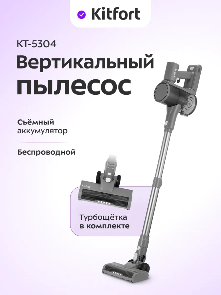 Беспроводной вертикальный пылесос Kitfort КТ-5304 очень удобен при локальной уборке. При отсоединении удлинительной трубки и установке насадки он превращается в ручной пылесос. Его конструкция позволяет легко проникать в самые труднодоступные уголки квартиры. При этом не нужно передвигать громоздкий корпус проводного пылесоса и управляться с непослушным шлангом. Благодаря работе от аккумулятора не нужно включать вилку в розетку, провода не мешают под ногами.