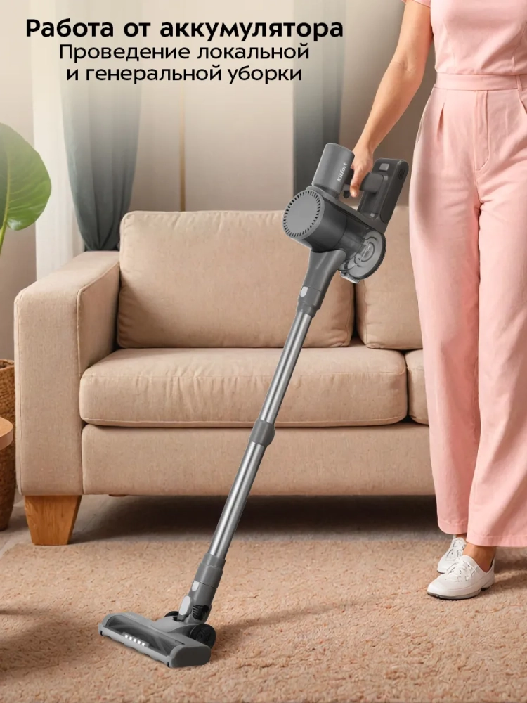 Одно из главных достоинств вертикального пылесоса — его компактность. Во время работы пылесос благодаря своей маневренности поможет легко убраться в узком коридоре или комнате, заполненной различными предметами. У пылесоса нет функции вертикальной парковки, поэтому пылесос рекомендуется устанавливать на кронштейн из комплекта, который крепится к стене. Для владельцев небольших квартир, которые сталкиваются с проблемой того, где хранить пылесос, приобретение этой модели будет оптимальным вариантом.