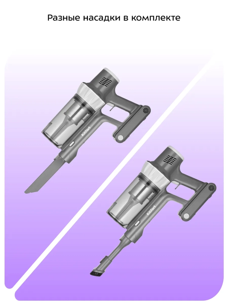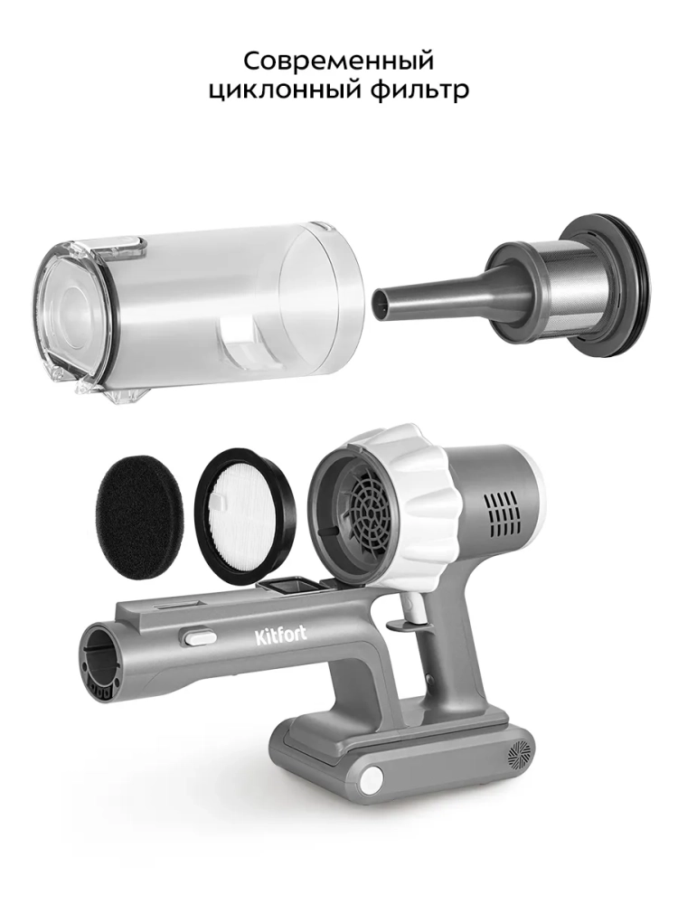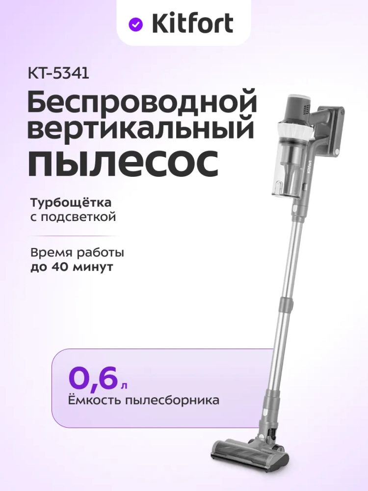 Беспроводной вертикальный пылесос Kitfort КТ-5341 очень удобен при локальной уборке. При отсоединении удлинительной трубки и установке насадки он превращается в ручной пылесос. Его конструкция позволяет легко проникать в самые труднодоступные уголки квартиры. При этом не нужно передвигать громоздкий корпус проводного пылесоса и управляться с непослушным шлангом. Благодаря работе от аккумулятора не нужно включать вилку в розетку, провода не мешают под ногами.