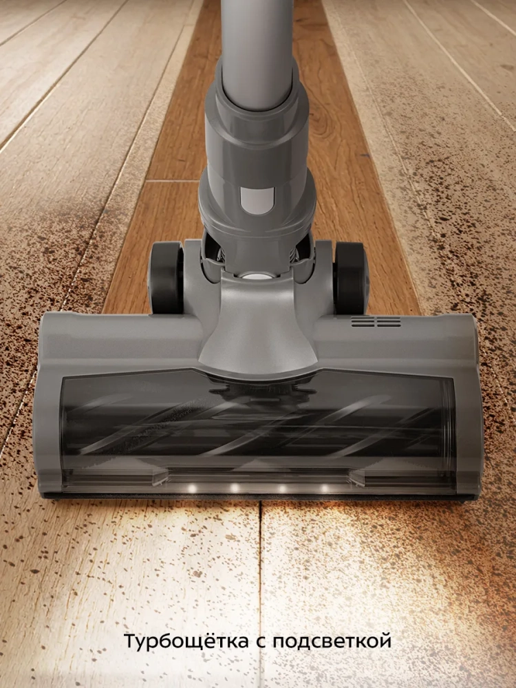Пылесос комплектуется напольной насадкой с турбощеткой, которая помогает качественно справиться с очисткой гладких поверхностей и ковровых покрытий с не очень длинным ворсом. Светодиодная подсветка напольной щетки сделает уборку комфортной даже в затемненных местах. Также к пылесосу прилагаются насадка «2 в 1», щелевая насадка и кронштейн для настенного хранения устройства, у которого предусмотрено место для хранения насадок.