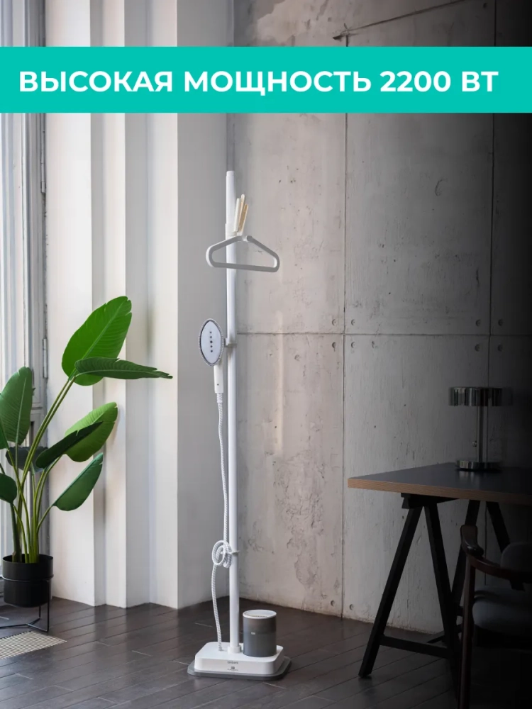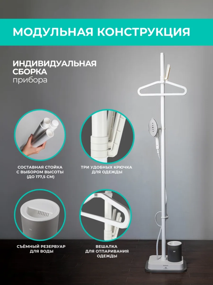 Преимущества прибора: 2 режима работы - глажение и отпаривание. Модульная конструкция - индивидуальная сборка прибора. Съемный резервуар для воды с верхним заливом. Утюжок для глажения с антипригарным покрытием. Вешалка для одежды и крючки в комплекте. Постоянный пар до 40 г/мин. Регулировка подачи пара. Вертикальное и горизонтальное глажение.