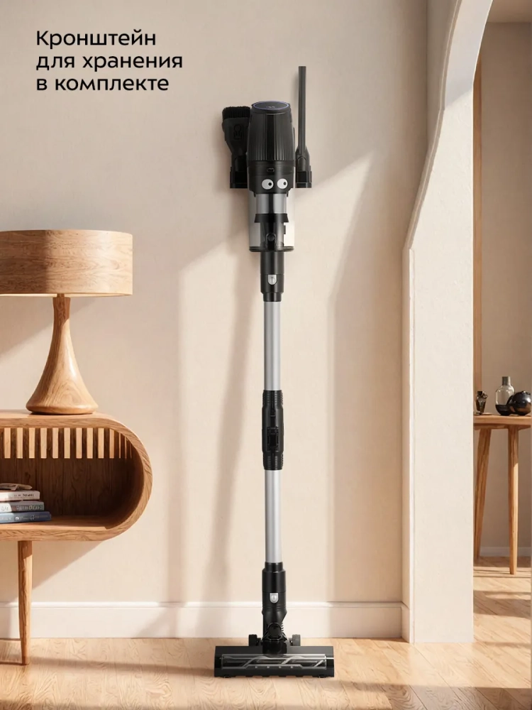 Одно из главных достоинств вертикального пылесоса — его компактность. Во время работы пылесос благодаря своей маневренности поможет легко убраться в узком коридоре или комнате, заполненной различными предметами. У пылесоса есть функция вертикальной парковки, поэтому пылесос удобно ставить в перерывах во время уборки. Для удобства хранения в комплекте поставляется кронштейн, который крепится к стене.