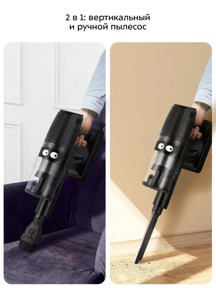 Конструкция «2 в 1» предусматривает наличие ручного пылесоса, который удобно использовать отдельно. Ручным пылесосом можно пропылесосить углы и плинтусы, обивку мебели, пыль со шкафов, шкафчики на кухне или в гостиной, книжные полки, коврики в автомобиле или багажник.