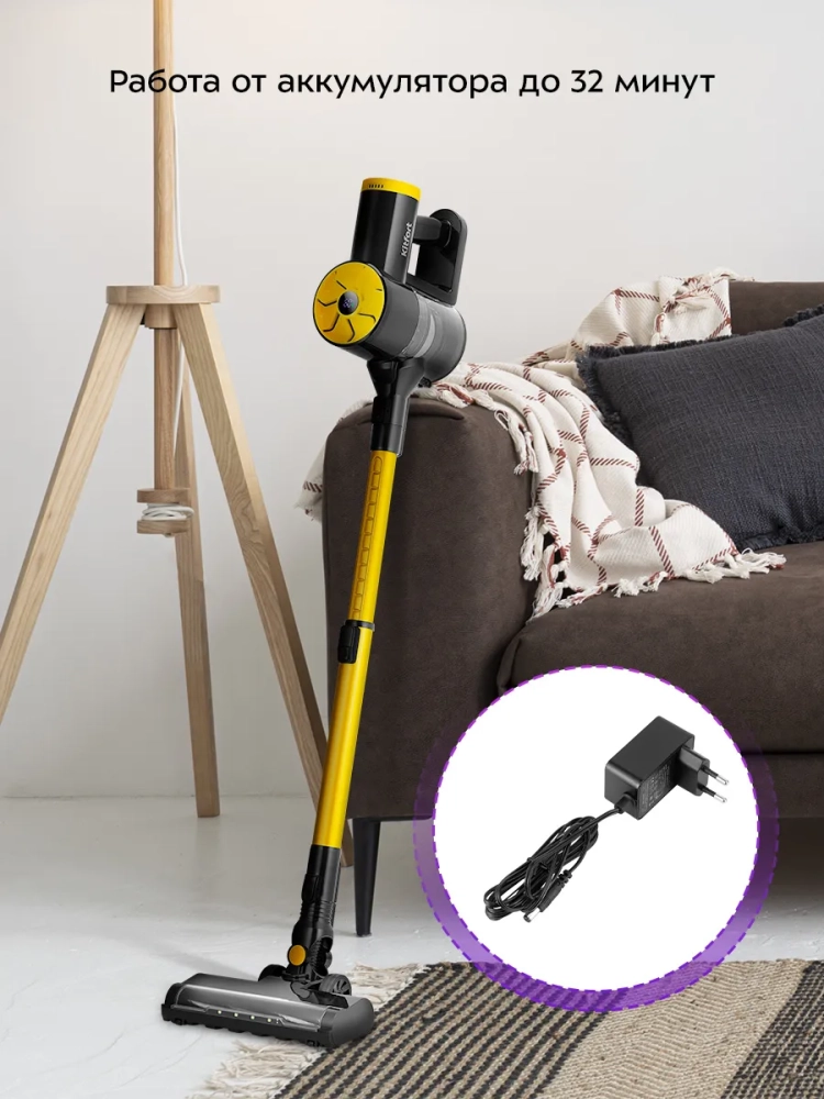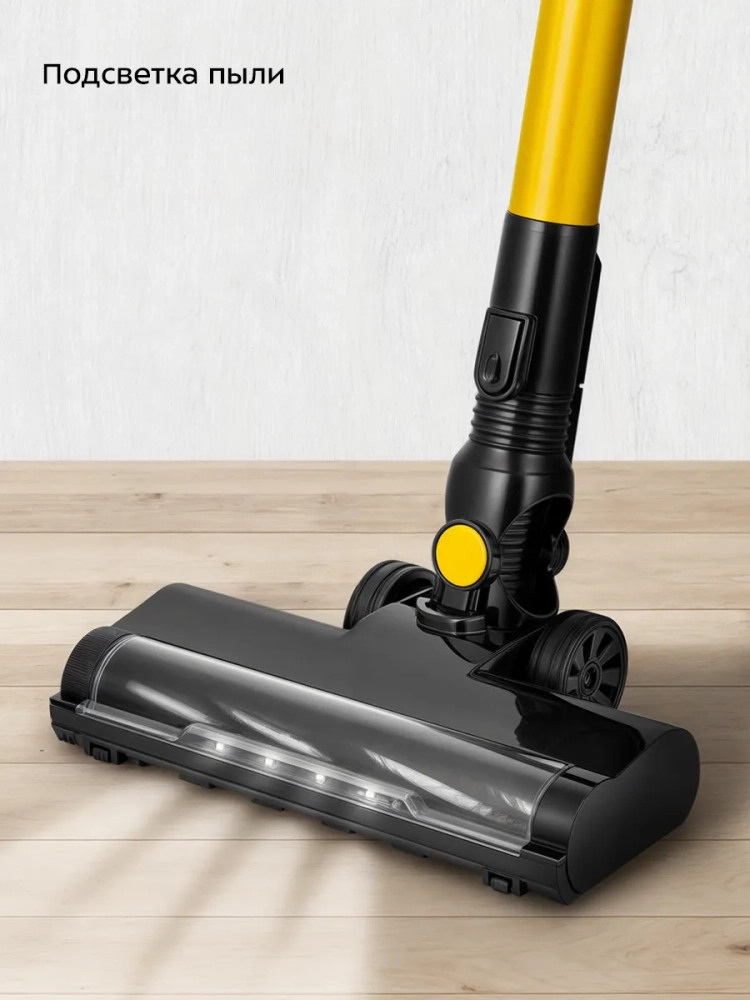 Пылесос комплектуется напольной насадкой с турбощеткой, которая помогает качественно справиться с очисткой гладких поверхностей и ковровых покрытий с не очень длинным ворсом. Светодиодная подсветка напольной щетки сделает уборку комфортной даже в затемненных местах. Также к пылесосу прилагаются насадка «2 в 1», щелевая насадка и кронштейн для настенного хранения устройства.