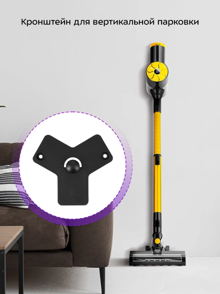 Одно из главных достоинств вертикального пылесоса — его компактность. Во время работы пылесос благодаря своей маневренности поможет легко убраться в узком коридоре или комнате, заполненной различными предметами. У пылесоса есть функция вертикальной парковки, поэтому пылесос удобно ставить в перерывах во время уборки. Для удобства хранения в комплекте поставляется кронштейн, который крепится к стене.
