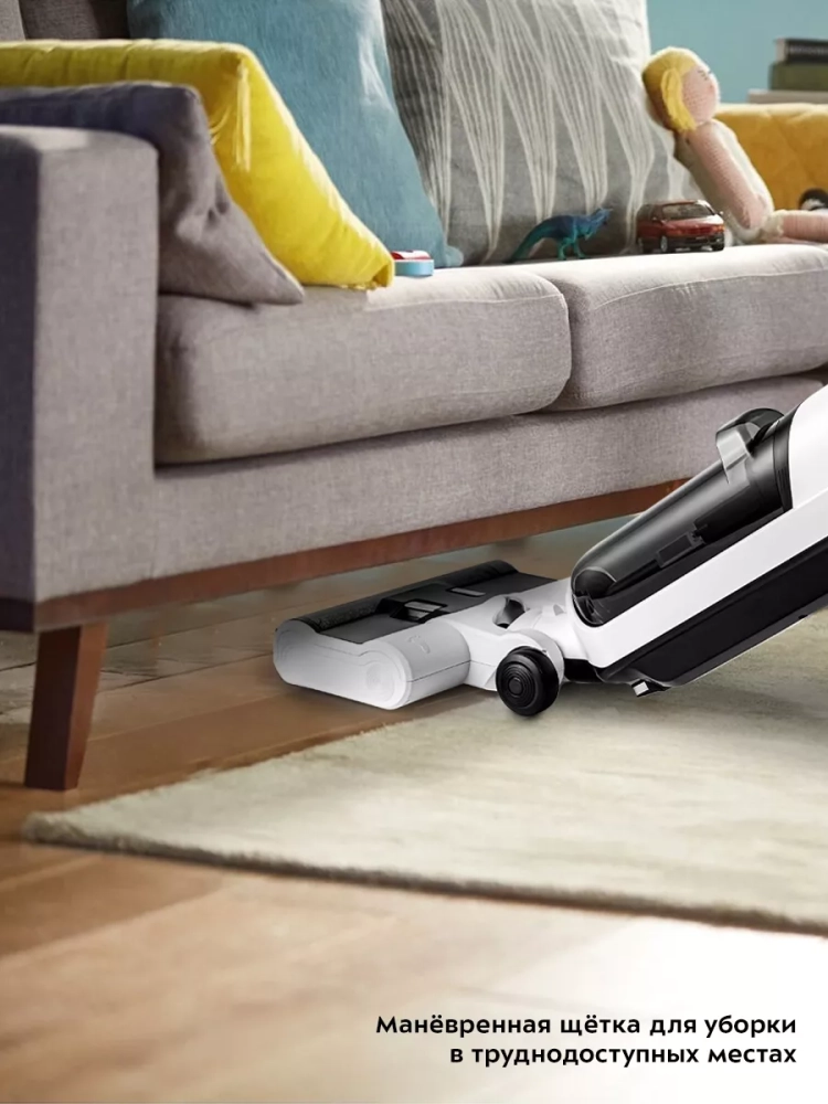 Во время уборки можно автоматически промыть турбощетку-валик. Это очень удобно и экономит время. Для этого установите пылесос на базу, подключенную к сети, убедитесь, что в резервуаре для чистой воды есть вода, и нажмите на кнопку «Автоматическая очистка турбощетки-валика» в нижней части ручки.