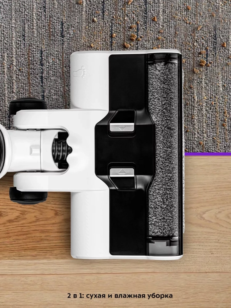 В щетку прибора встроен специальный скребок, который вытирает лишнюю влагу от турбощетки-валика. В результате пол после уборки не такой влажный, как если бы мы убирались паровыми швабрами или другими моющими пылесосами.