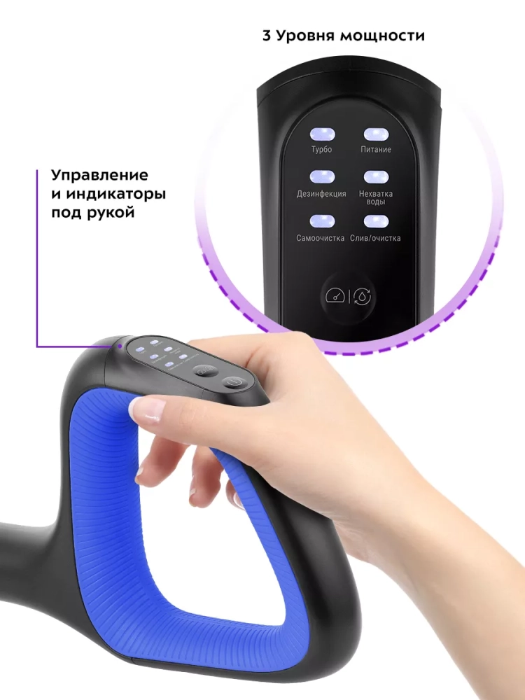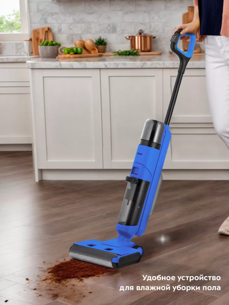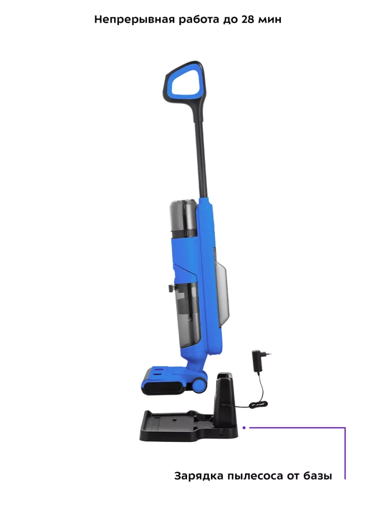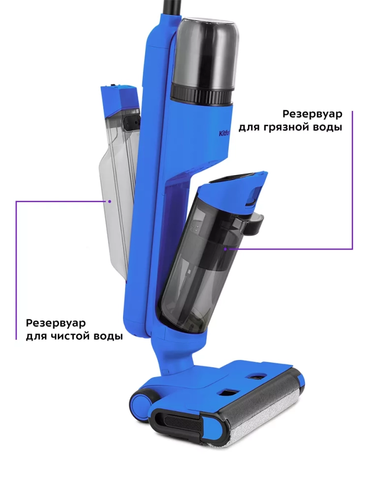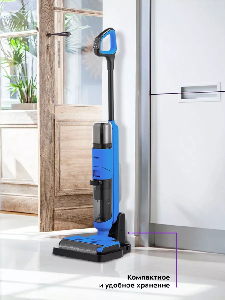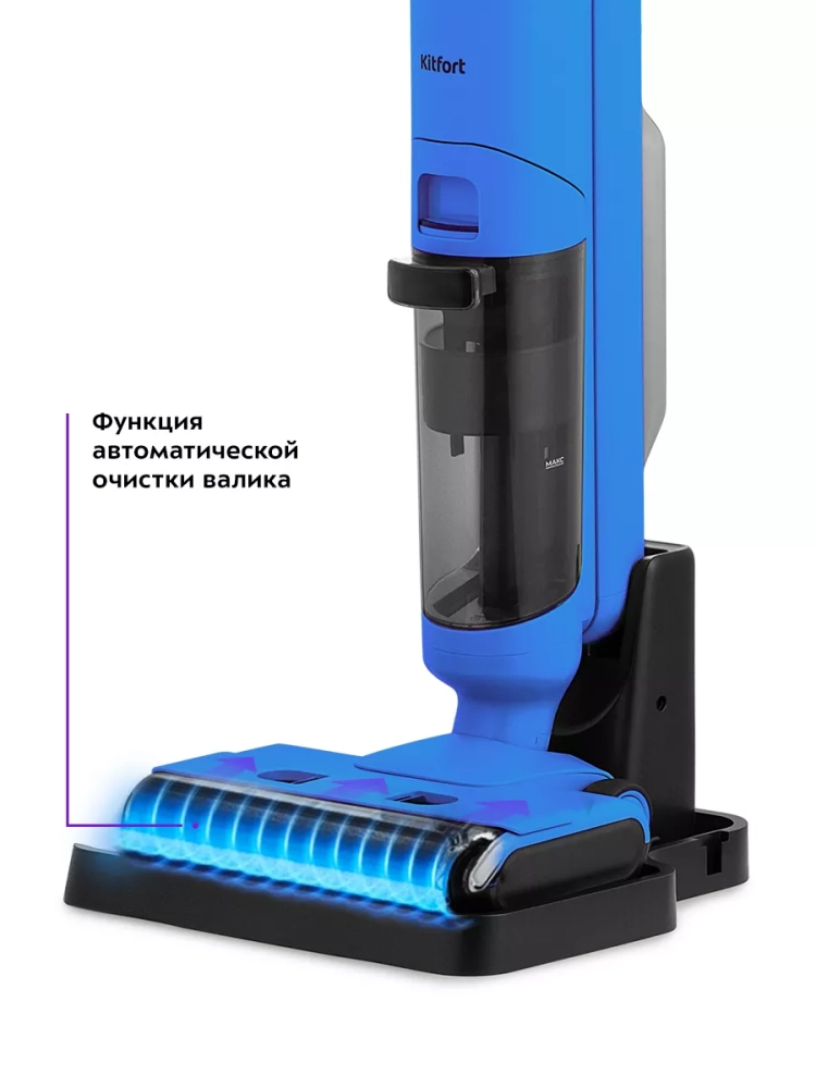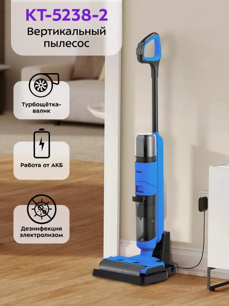 Беспроводной вертикальный моющий пылесос Kitfort КТ-5238 очень удобен при проведении влажной уборки. Благодаря работе от аккумулятора во время использования пылесос не нужно включать в сеть и провода не будут мешаться под ногами. Турбощетка оснащена устройством для электролиза воды, которое позволяет очистить воду посредством электрического разряда.