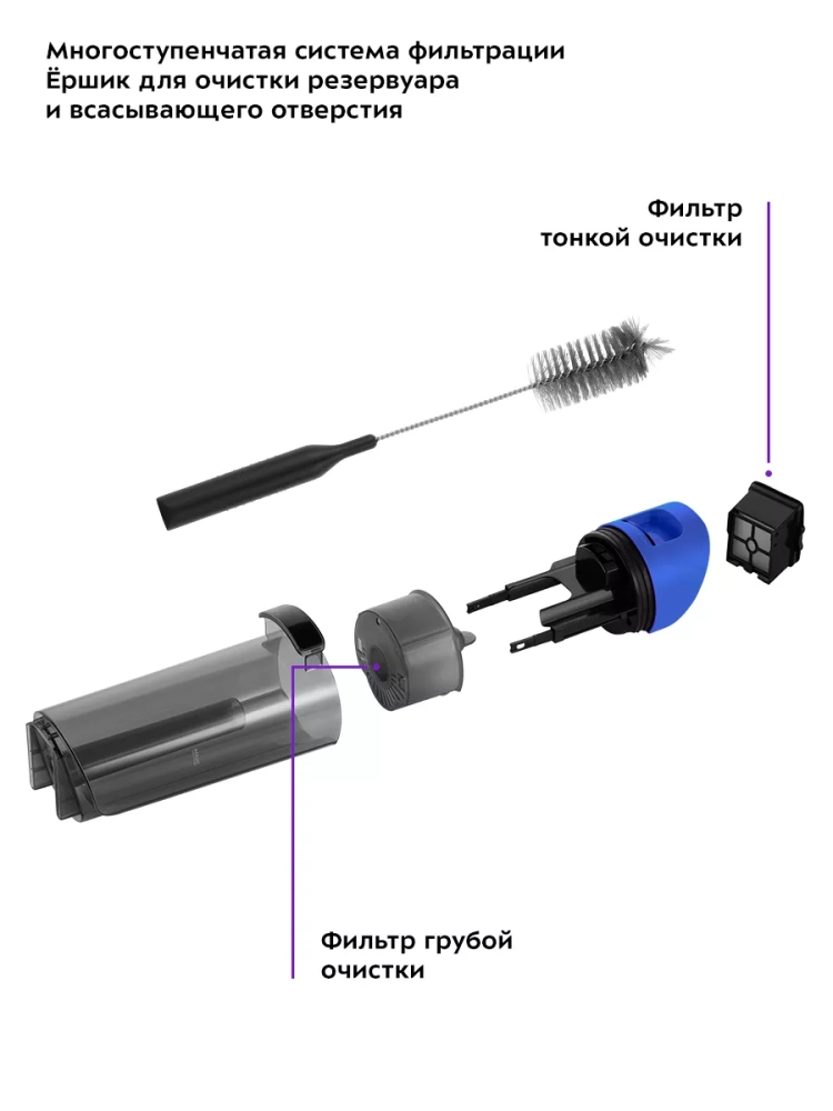 Моющий пылесос оснащен функцией самоочистки, что очень удобно и экономит время. Резервуары для чистой и грязной воды, фильтры и валик турбощетки легко снимаются и очищаются. В комплекте также идет ершик для очистки. Удлинительная ручка съемная, поэтому прибор можно разобрать для компактного хранения.