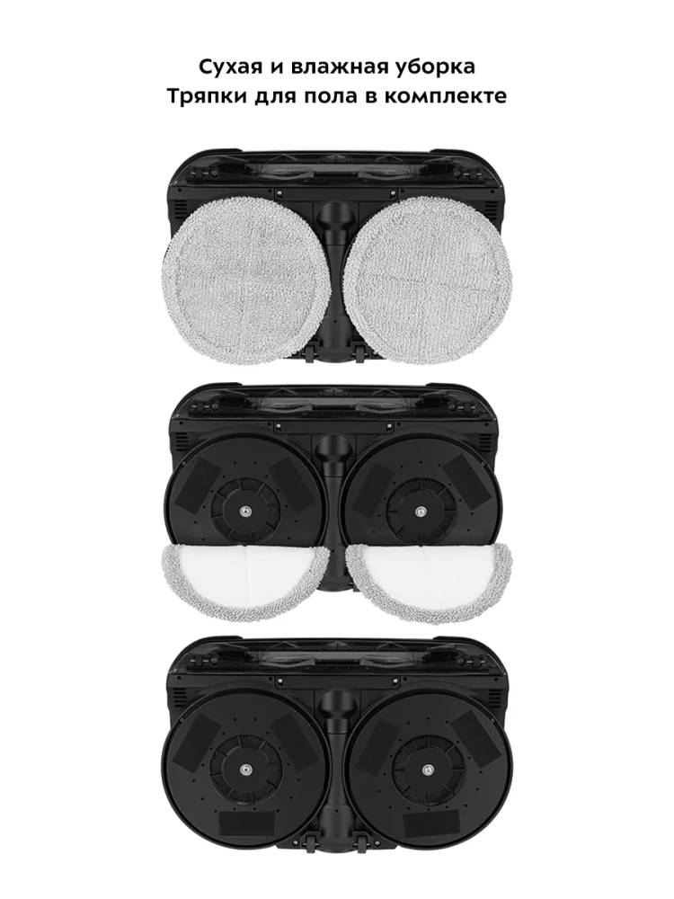 Чтобы помыть полы, необходимо надеть тряпки на диски щетки для пола и включить режим влажной уборки — диски начнут вращаться и полировать поверхность. Вода подается на тряпки автоматически.
