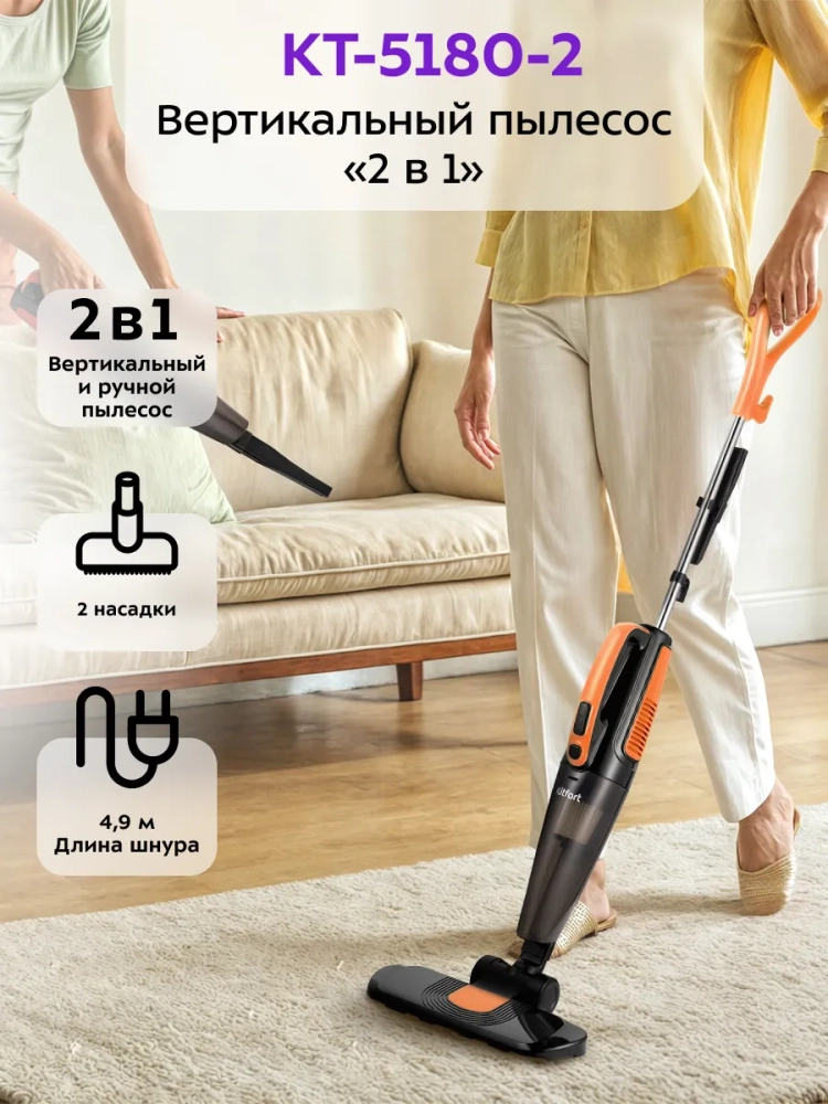 Вертикальный пылесос хорошо подходит для оперативной уборки, например, рассыпанных крошек или песка от обуви в коридоре. У пылесоса КТ-5180 есть специальные держатели для удобного хранения шнура, а также держатель узкой насадки, который можно прикрепить к удлинительной трубке.