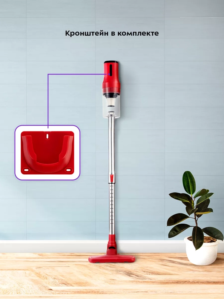 Одно из главных достоинств вертикального пылесоса — его компактность. Во время работы пылесос благодаря своей маневренности может легко убраться в узком коридоре или комнате, заполненной различными предметами. У пылесоса нет функции вертикальной парковки, поэтому пылесос рекомендуется устанавливать на стену с помощью кронштейна, идущего в комплекте.