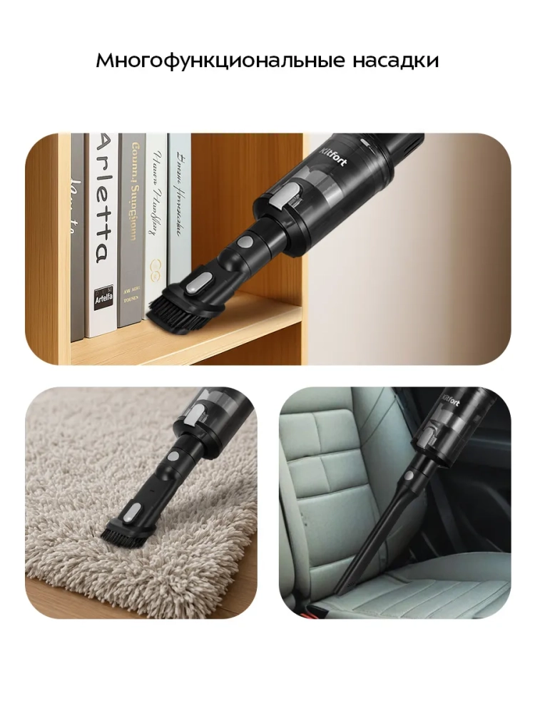 Беспроводной вертикальный пылесос Kitfort КТ-5303 очень удобен при локальной и генеральной уборке. Он компактен, всегда под рукой и готов к работе. При отсоединении удлинительной трубки и установке насадки он превращается в ручной пылесос. Его конструкция позволяет легко проникать в самые труднодоступные уголки квартиры. При этом не нужно передвигать громоздкий корпус проводного пылесоса и управляться с непослушным шлангом. Благодаря работе от аккумулятора не нужно включать вилку в розетку, провода не будут мешать под ногами. Поэтому пылесос имеет неограниченный радиус действия: от любого уголка квартиры до машины или беседки в саду. Пылесос оснащен маневренной турбощеткой, которая вращается в двух плоскостях.